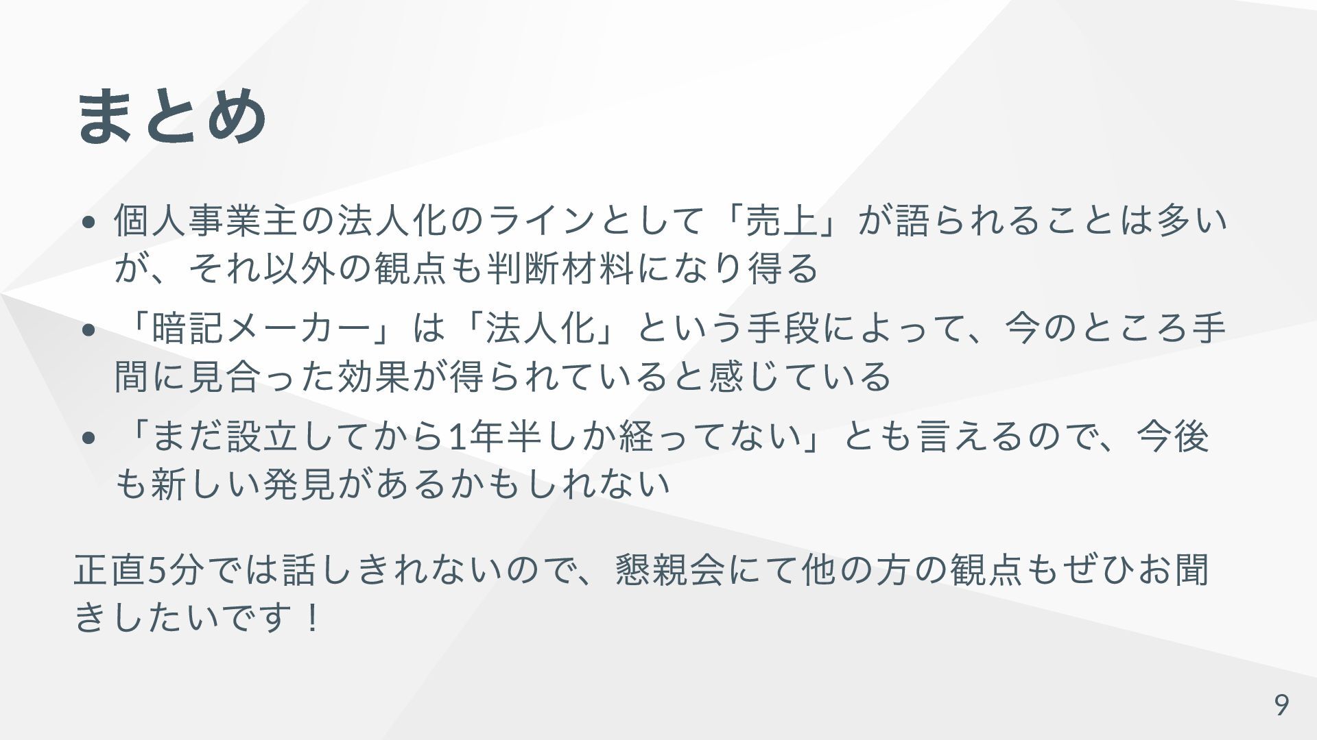 まとめ 個人事業主の法人化のラインとして「売上」が語られることは多い が、それ以外の観点も判断材料になり得る 「暗記メーカー」は「法人化」という手段によって、今のところ手 間に見合った効果が得られていると感じている 「まだ設立してから1 年半しか経ってない」とも言えるので、今後 も新しい発見があるかもしれない 正直5 分では話しきれないので、懇親会にて他の方の観点もぜひお聞