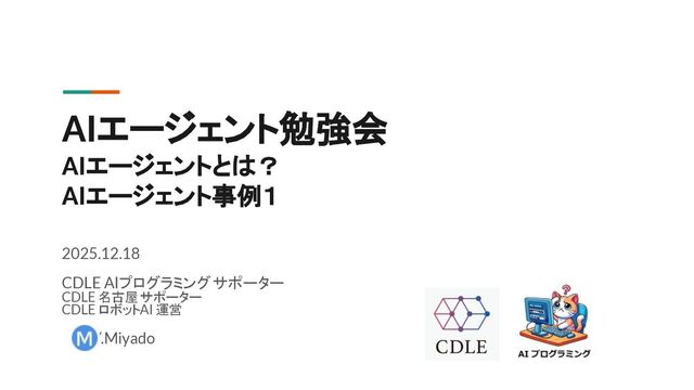 AIエージェント勉強会 AIエージェントとは? AIエージェント事例1 2025.12.18 CDLE AIプログラミング サポーター CDLE 名古屋 サポーター