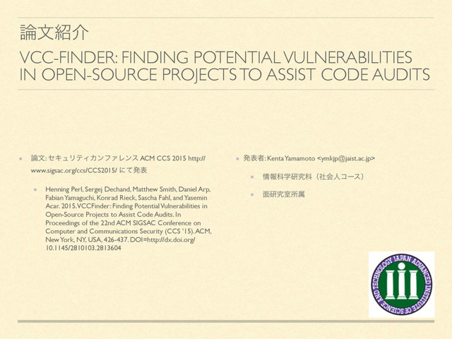 Henning Perl, Sergej Dechand, Matthew Smith, Daniel Arp, Fabian Yamaguchi, Konrad Rieck, Sascha Fahl, and Yasemin Acar. 2015. VCCFinder: Finding Potential Vulnerabilities in Open-Source Projects to Assist Code Audits. In Proceedings of the 22nd ACM SIGSAC Conference on Computer and Communications Security (CCS '15). ACM, New York, NY, USA, 426-437. DOI=http://dx.doi.org/10.1145/2810103.2813604
