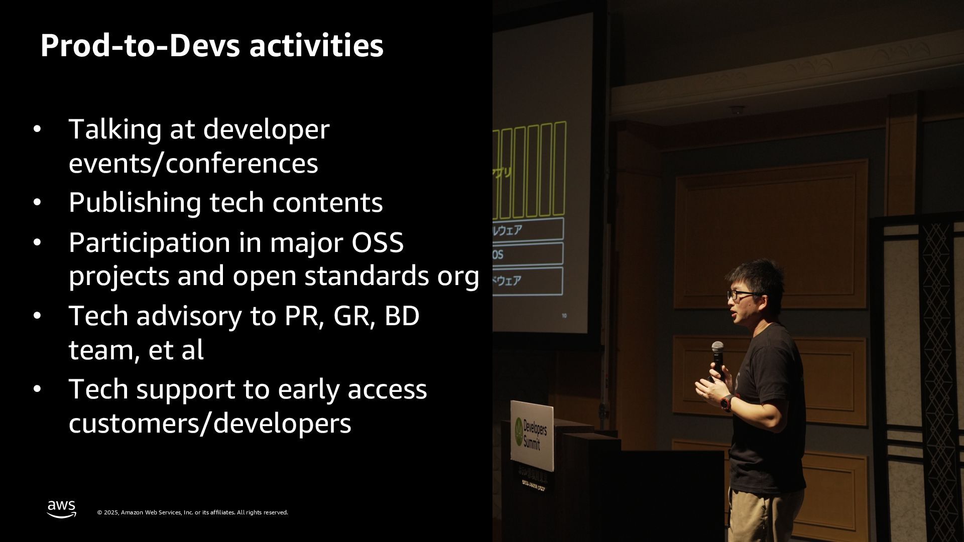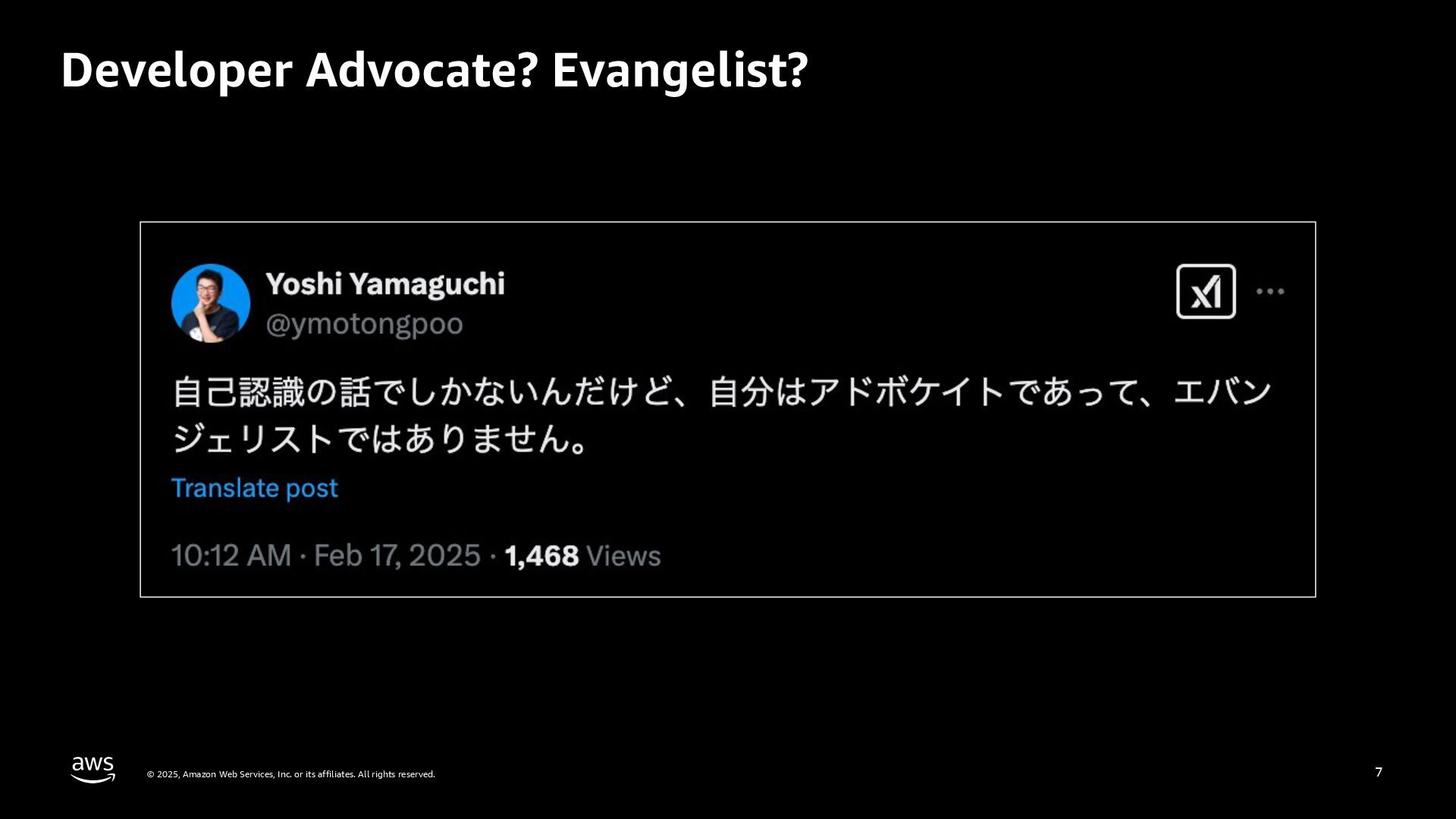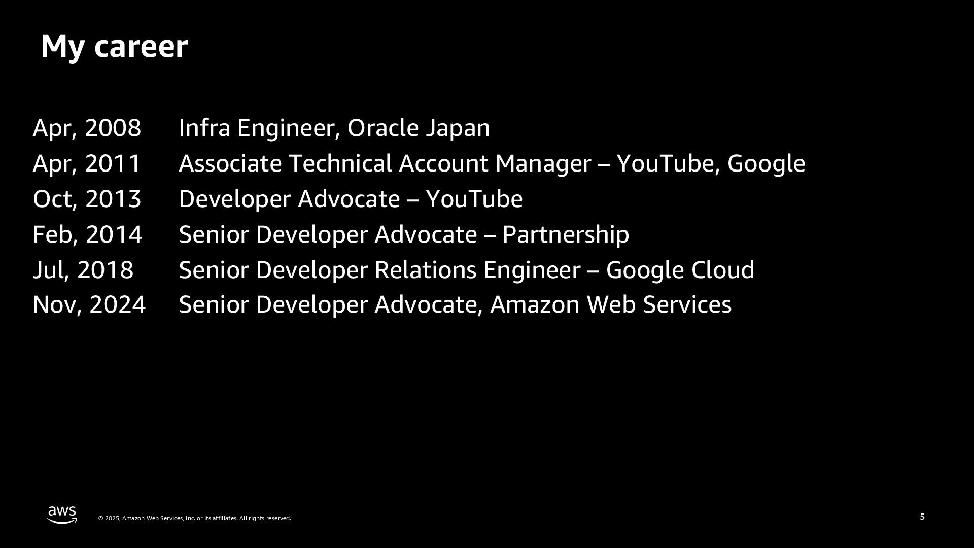 rights reserved. 5 My career Apr, 2008 Infra Engineer, Oracle Japan Apr, 2011 Associate Technical Account Manager – YouTube, Google Oct, 2013 Developer Advocate – YouTube Feb, 2014 Senior Developer Advocate – Partnership Jul, 2018 Senior Developer Relations Engineer – Google Cloud Nov, 2024 Senior Developer Advocate, Amazon Web Services