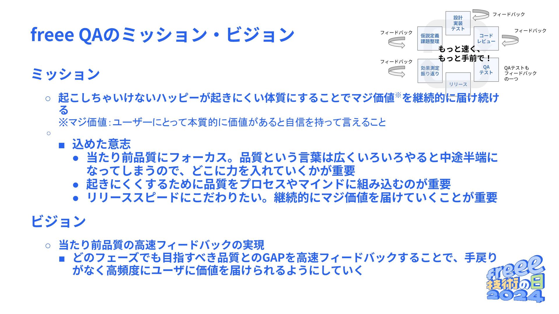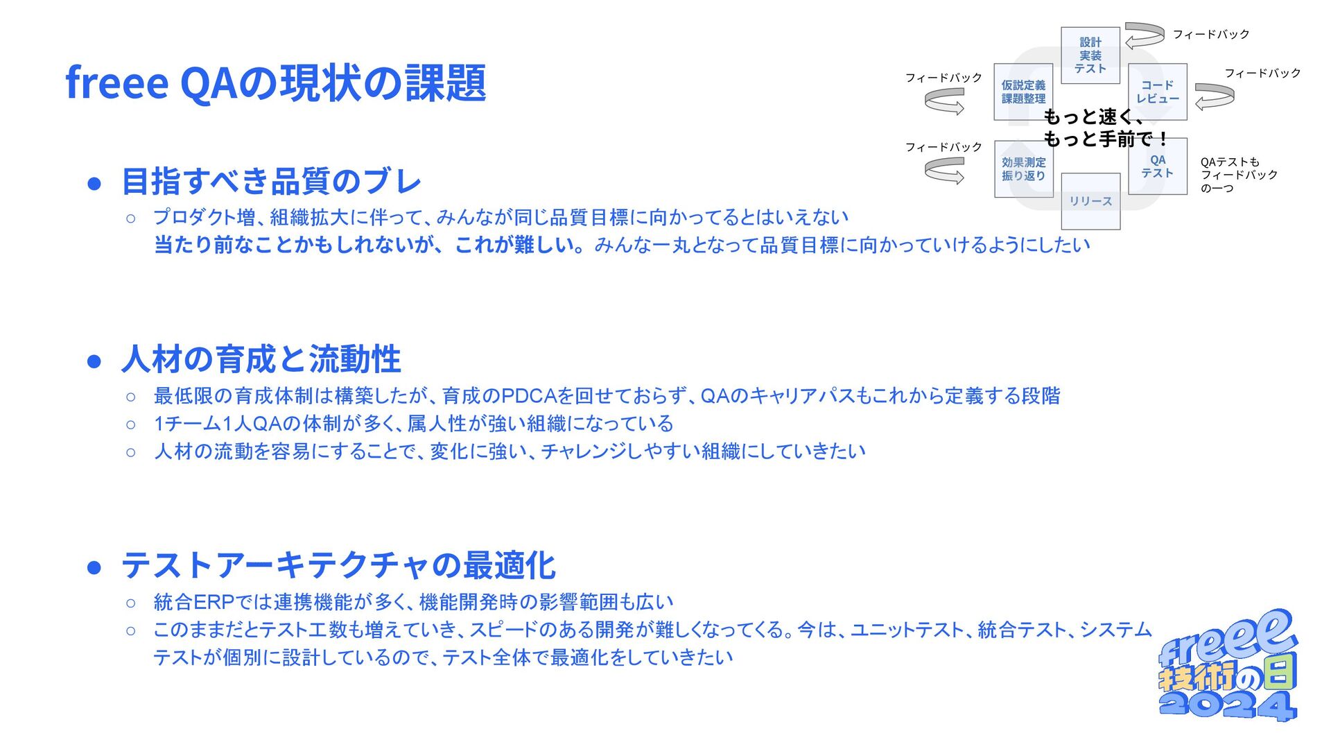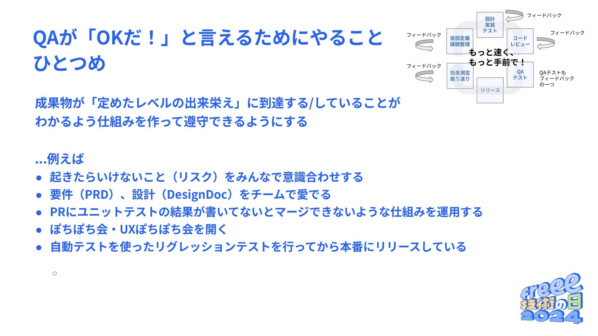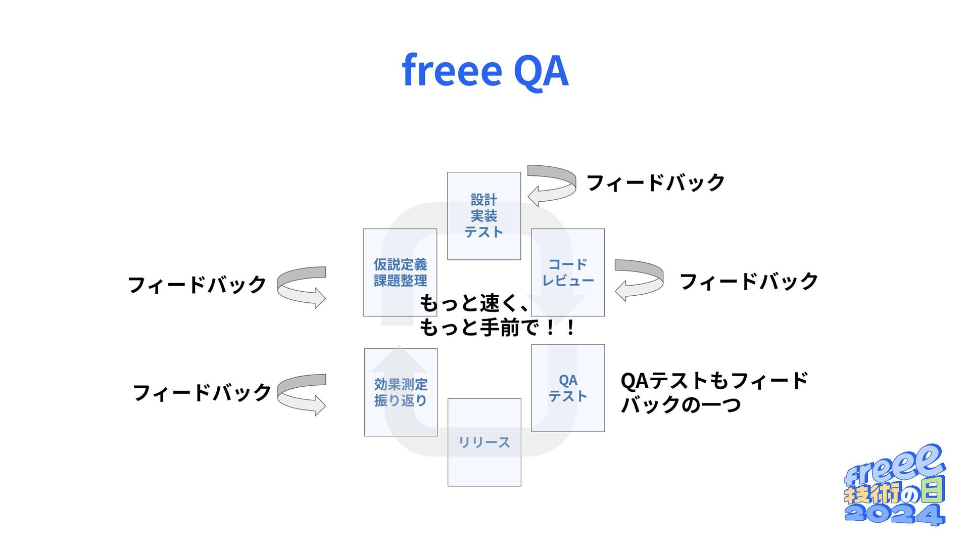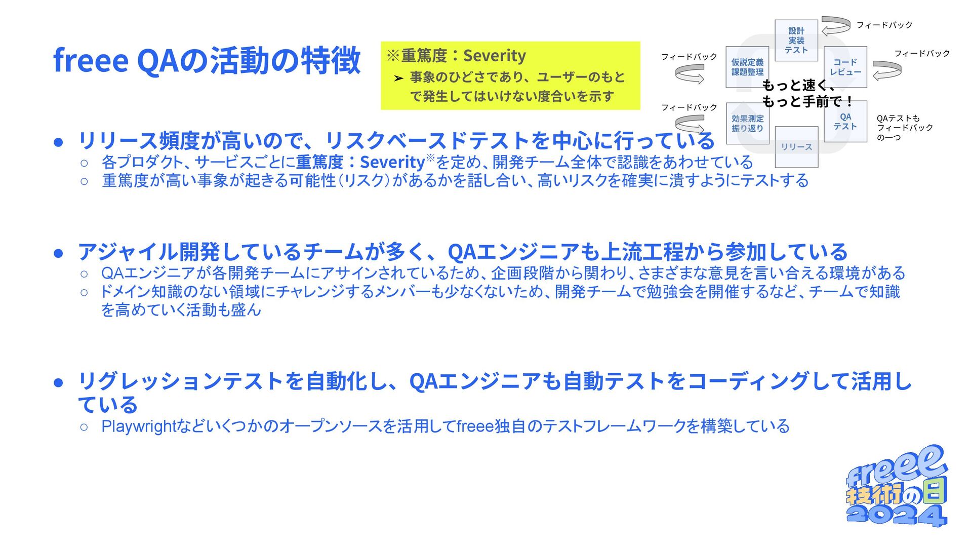 効果測定 振り返り QA テスト フィードバック フィードバック フィードバック フィードバック QAテストも フィードバック の⼀つ ※重篤度:Severity ➢ 事象のひどさであり、ユーザーのもと で発⽣してはいけない度合いを⽰す • リリース頻度が⾼いので、リスクベースドテストを中⼼に⾏っている ◦ 各プロダクト、サービスごとに重篤度:Severity※を定め、開発チーム全体で認識をあわせている ◦ 重篤度が高い事象が起きる可能性(リスク)があるかを話し合い、高いリスクを確実に潰すようにテストする • アジャイル開発しているチームが多く、QAエンジニアも上流⼯程から参加している ◦ QAエンジニアが各開発チームにアサインされているため、企画段階から関わり、さまざまな意見を言い合える環境がある ◦ ドメイン知識のない領域にチャレンジするメンバーも少なくないため、開発チームで勉強会を開催するなど、チームで知識 を高めていく活動も盛ん • リグレッションテストを⾃動化し、QAエンジニアも⾃動テストをコーディングして活⽤し ている ◦ Playwrightなどいくつかのオープンソースを活用してfreee独自のテストフレームワークを構築している もっと速く、 もっと⼿前で!