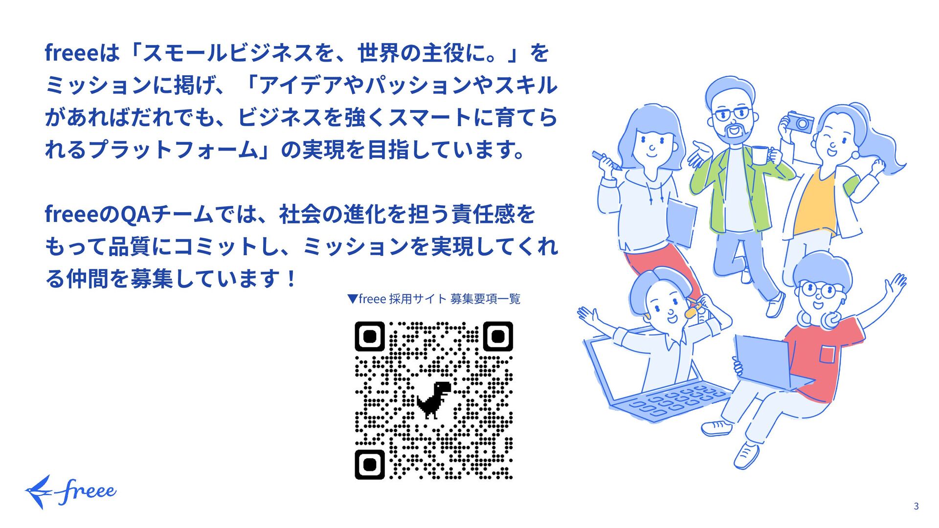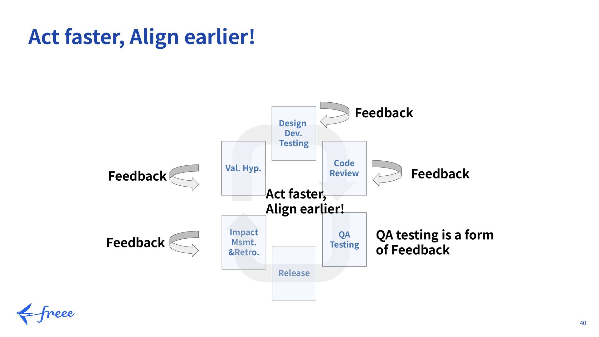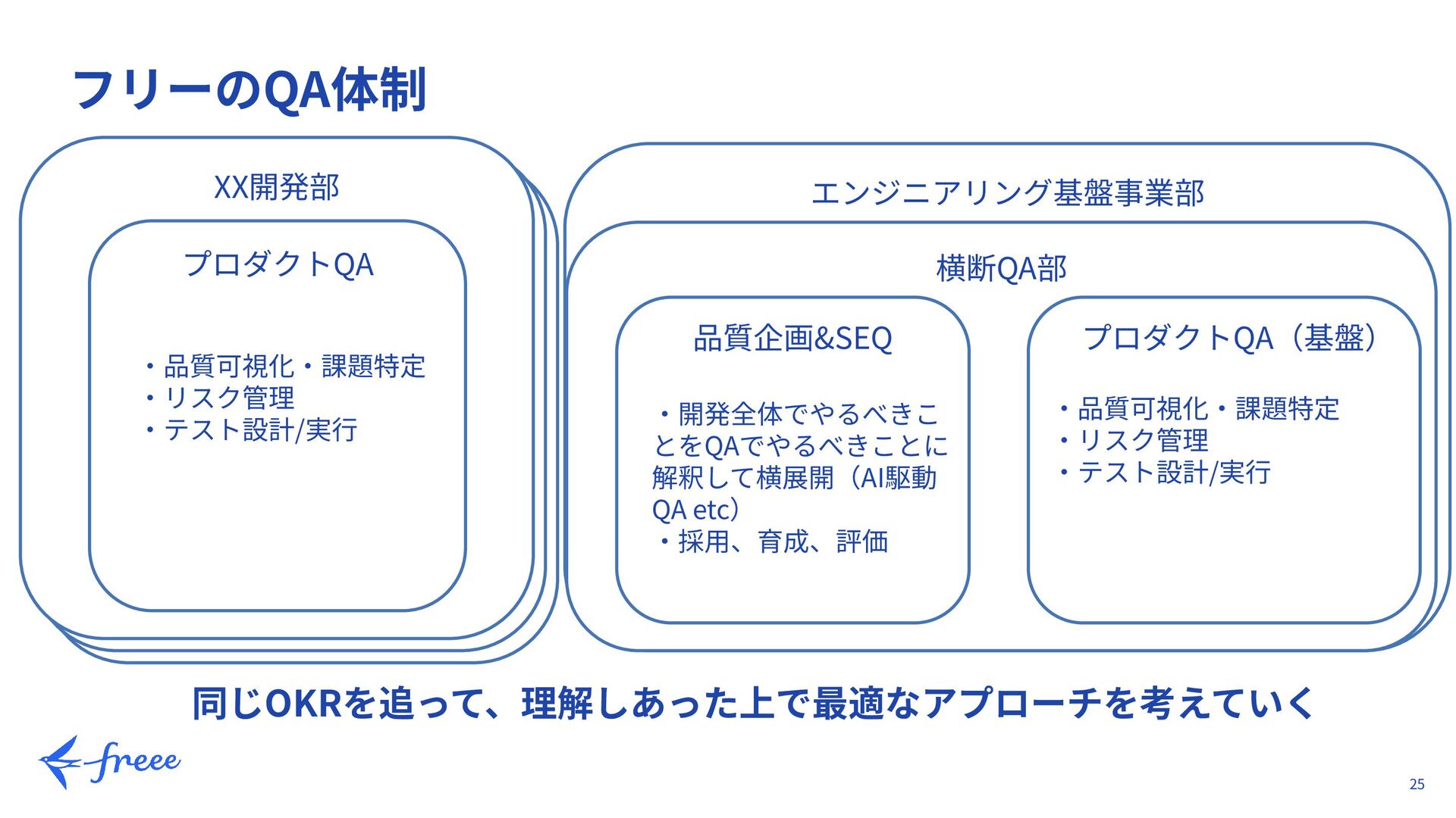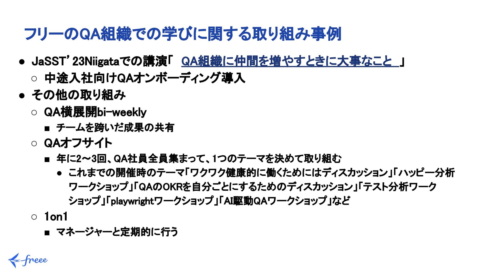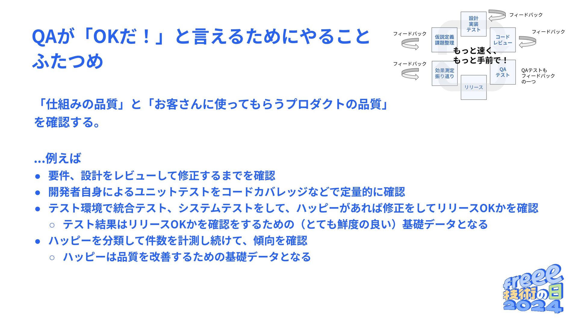 効果測定 振り返り QA テスト フィードバック フィードバック フィードバック フィードバック QAテストも フィードバック の⼀つ ※重篤度:Severity ➢ 事象のひどさであり、ユーザーのもと で発⽣してはいけない度合いを⽰す • リリース頻度が⾼いので、リスクベースドテストを中⼼に⾏っている ◦ 各プロダクト、サービスごとに重篤度:Severity※を定め、開発チーム全体で認識をあわせている ◦ 重篤度が高い事象が起きる可能性(リスク)があるかを話し合い、高いリスクを確実に潰すようにテストする • アジャイル開発しているチームが多く、QAエンジニアも上流⼯程から参加している ◦ QAエンジニアが各開発チームにアサインされているため、企画段階から関わり、さまざまな意見を言い合える環境がある ◦ ドメイン知識のない領域にチャレンジするメンバーも少なくないため、開発チームで勉強会を開催するなど、チームで知識 を高めていく活動も盛ん • リグレッションテストを⾃動化し、QAエンジニアも⾃動テストをコーディングして活⽤し ている ◦ Playwrightなどいくつかのオープンソースを活用してfreee独自のテストフレームワークを構築している もっと速く、 もっと⼿前で!