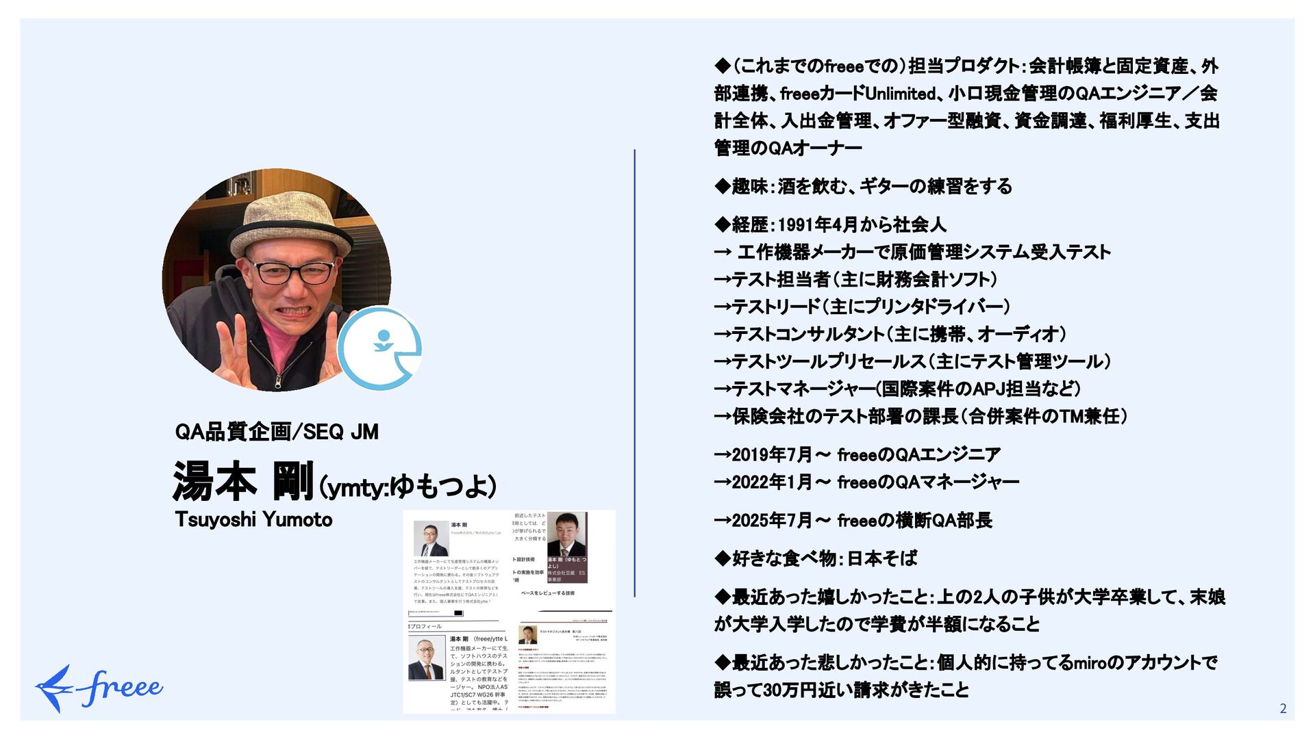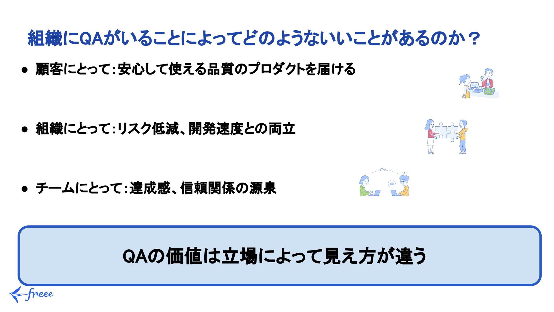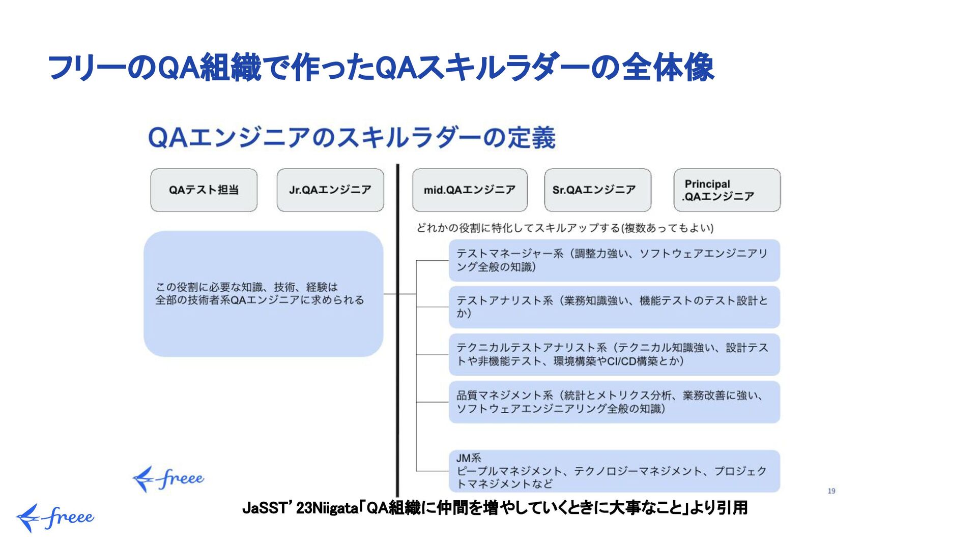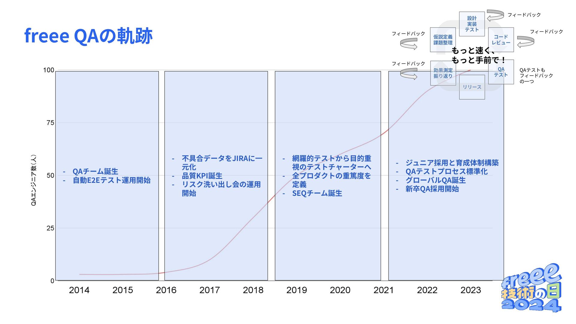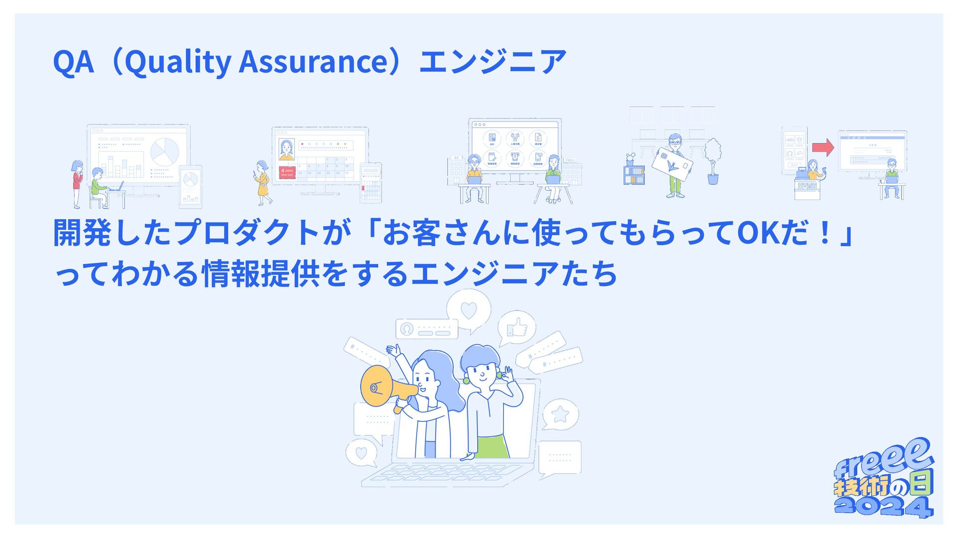 効果測定 振り返り QA テスト フィードバック フィードバック フィードバック フィードバック QAテストも フィードバック の⼀つ ※重篤度:Severity ➢ 事象のひどさであり、ユーザーのもと で発⽣してはいけない度合いを⽰す • リリース頻度が⾼いので、リスクベースドテストを中⼼に⾏っている ◦ 各プロダクト、サービスごとに重篤度:Severity※を定め、開発チーム全体で認識をあわせている ◦ 重篤度が高い事象が起きる可能性(リスク)があるかを話し合い、高いリスクを確実に潰すようにテストする • アジャイル開発しているチームが多く、QAエンジニアも上流⼯程から参加している ◦ QAエンジニアが各開発チームにアサインされているため、企画段階から関わり、さまざまな意見を言い合える環境がある ◦ ドメイン知識のない領域にチャレンジするメンバーも少なくないため、開発チームで勉強会を開催するなど、チームで知識 を高めていく活動も盛ん • リグレッションテストを⾃動化し、QAエンジニアも⾃動テストをコーディングして活⽤し ている ◦ Playwrightなどいくつかのオープンソースを活用してfreee独自のテストフレームワークを構築している もっと速く、 もっと⼿前で!