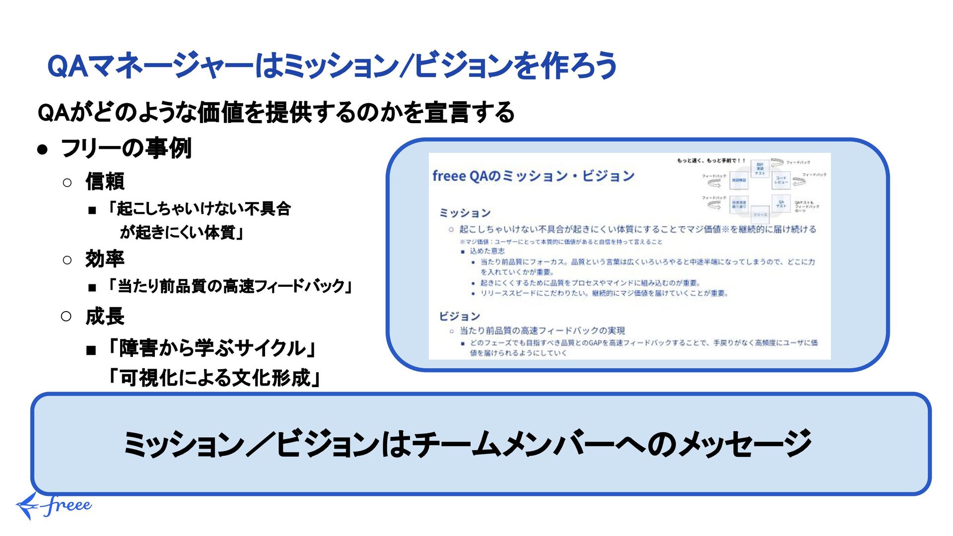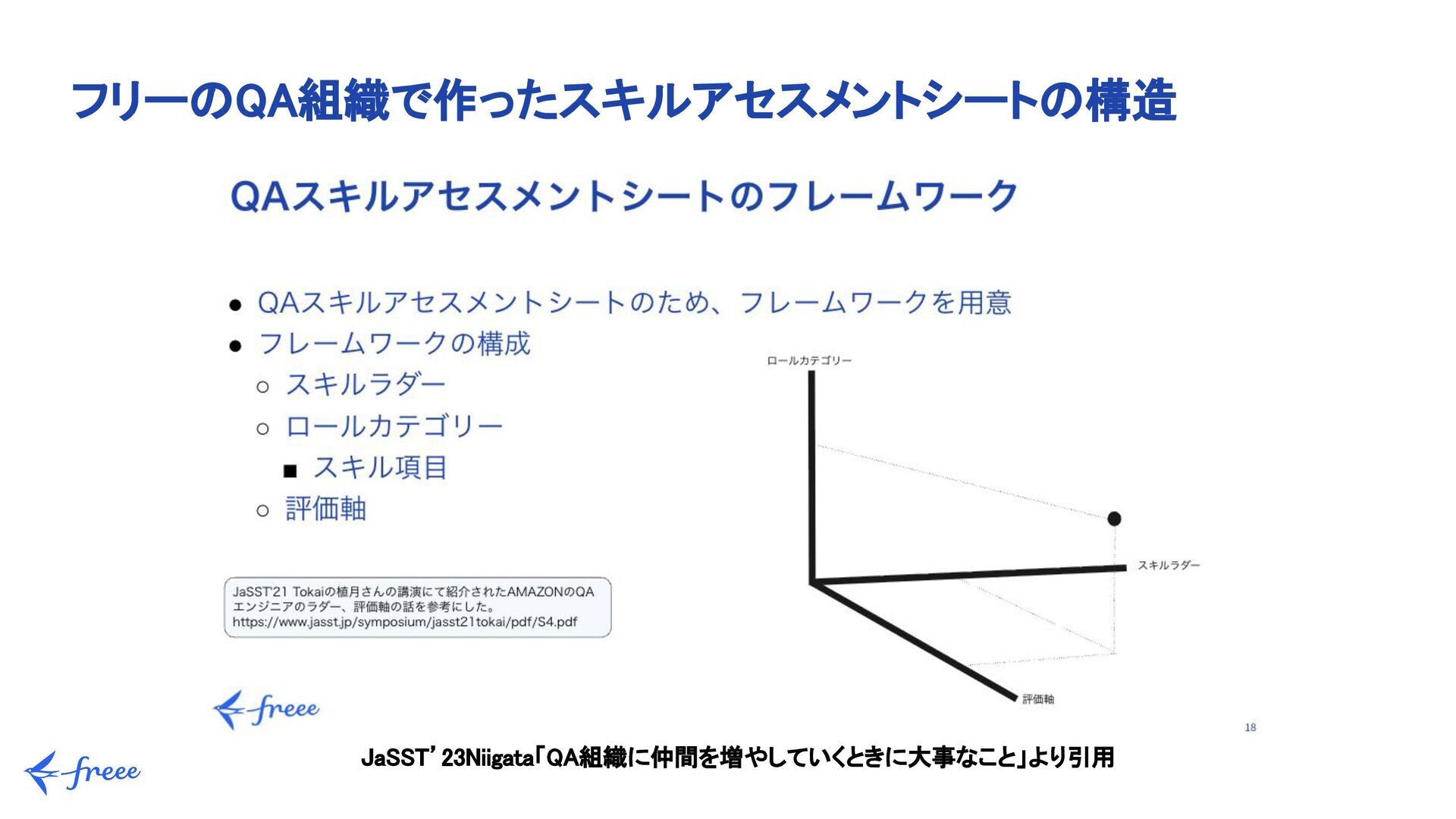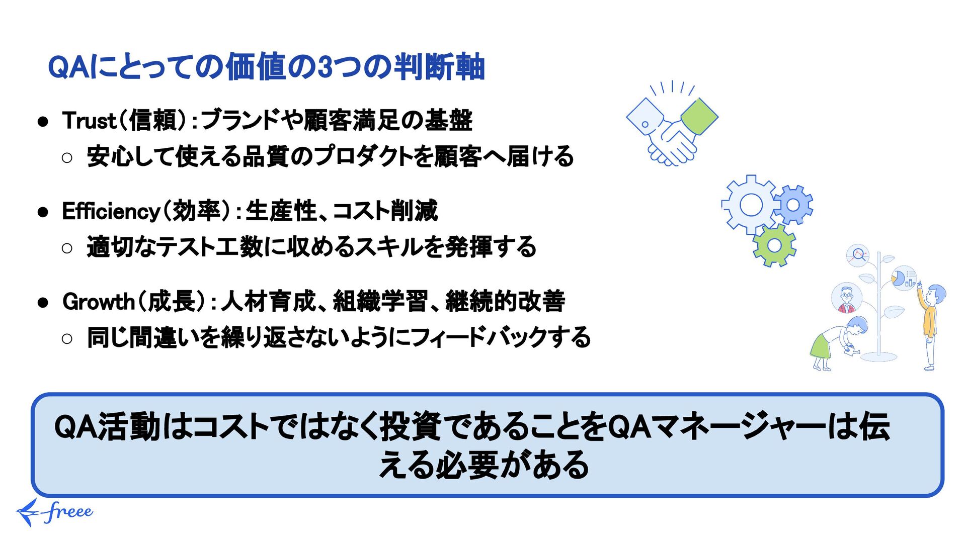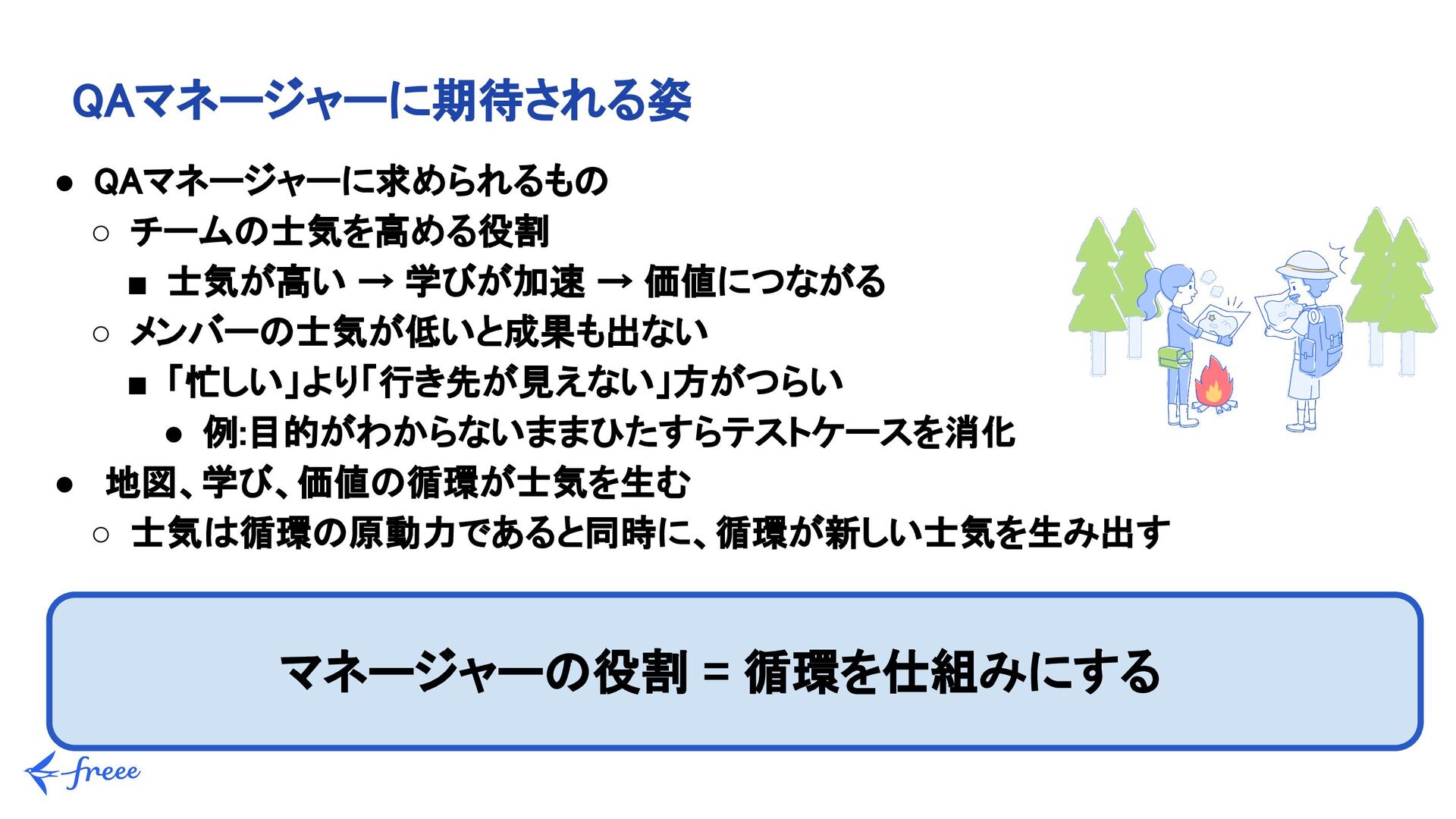効果測定 振り返り QA テスト フィードバック フィードバック フィードバック フィードバック QAテストも フィードバック の⼀つ ※重篤度:Severity ➢ 事象のひどさであり、ユーザーのもと で発⽣してはいけない度合いを⽰す • リリース頻度が⾼いので、リスクベースドテストを中⼼に⾏っている ◦ 各プロダクト、サービスごとに重篤度:Severity※を定め、開発チーム全体で認識をあわせている ◦ 重篤度が高い事象が起きる可能性(リスク)があるかを話し合い、高いリスクを確実に潰すようにテストする • アジャイル開発しているチームが多く、QAエンジニアも上流⼯程から参加している ◦ QAエンジニアが各開発チームにアサインされているため、企画段階から関わり、さまざまな意見を言い合える環境がある ◦ ドメイン知識のない領域にチャレンジするメンバーも少なくないため、開発チームで勉強会を開催するなど、チームで知識 を高めていく活動も盛ん • リグレッションテストを⾃動化し、QAエンジニアも⾃動テストをコーディングして活⽤し ている ◦ Playwrightなどいくつかのオープンソースを活用してfreee独自のテストフレームワークを構築している もっと速く、 もっと⼿前で!