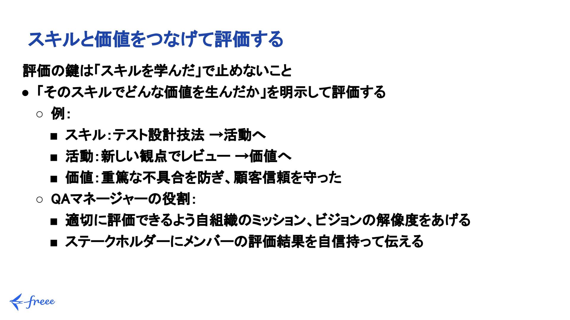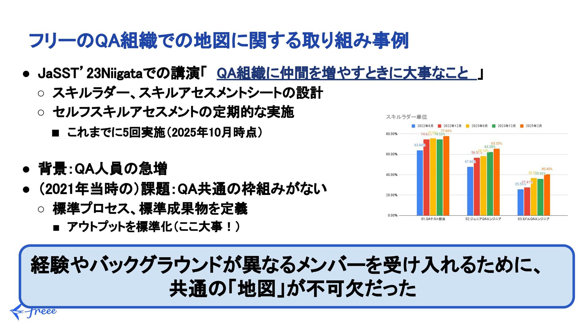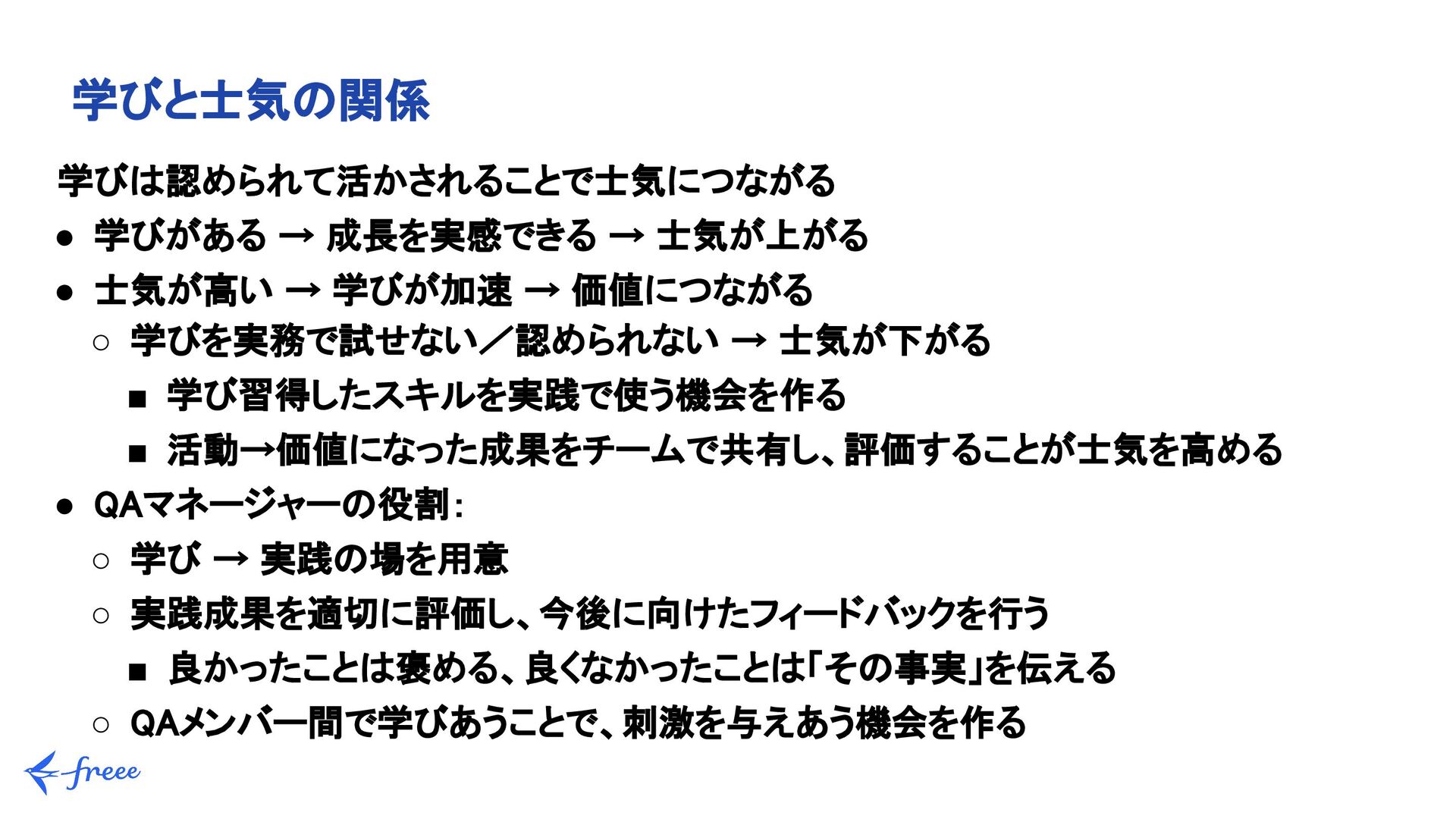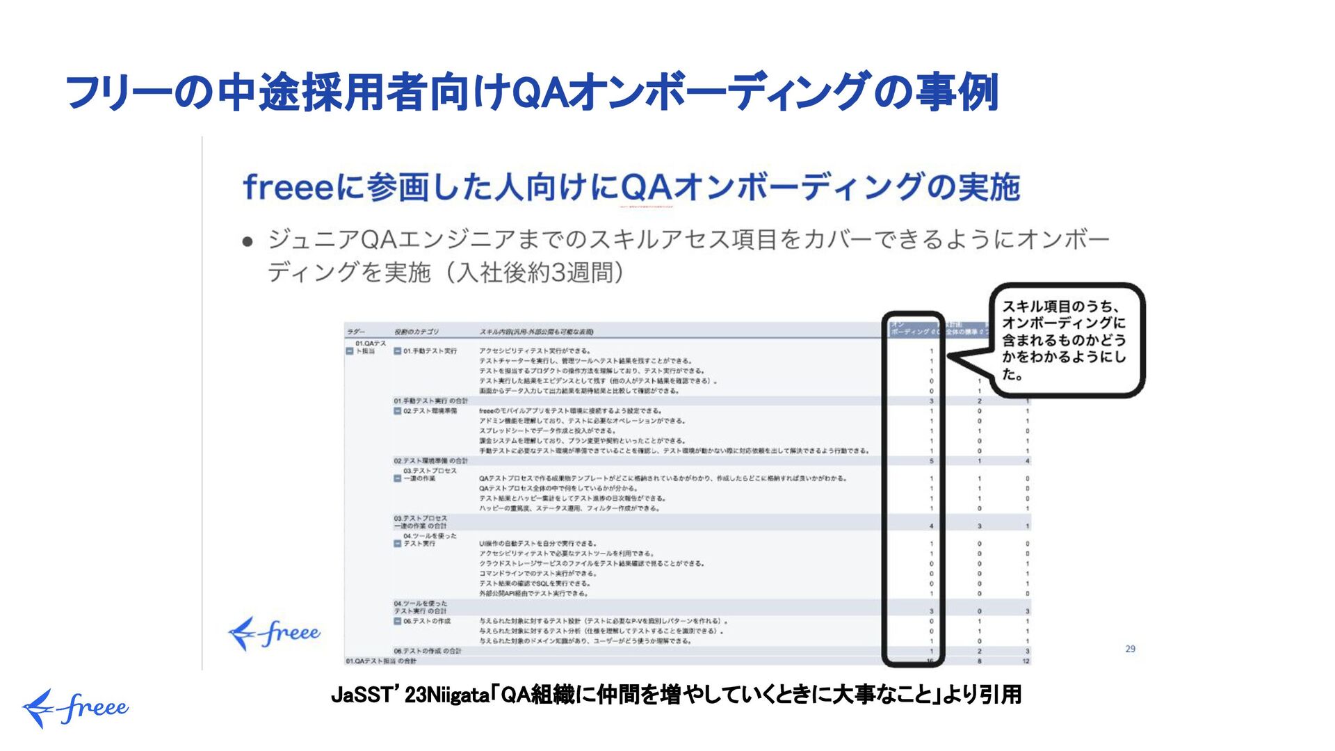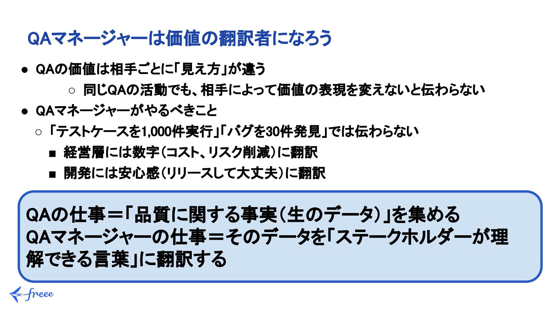 効果測定 振り返り QA テスト フィードバック フィードバック フィードバック フィードバック QAテストも フィードバック の⼀つ ※重篤度:Severity ➢ 事象のひどさであり、ユーザーのもと で発⽣してはいけない度合いを⽰す • リリース頻度が⾼いので、リスクベースドテストを中⼼に⾏っている ◦ 各プロダクト、サービスごとに重篤度:Severity※を定め、開発チーム全体で認識をあわせている ◦ 重篤度が高い事象が起きる可能性(リスク)があるかを話し合い、高いリスクを確実に潰すようにテストする • アジャイル開発しているチームが多く、QAエンジニアも上流⼯程から参加している ◦ QAエンジニアが各開発チームにアサインされているため、企画段階から関わり、さまざまな意見を言い合える環境がある ◦ ドメイン知識のない領域にチャレンジするメンバーも少なくないため、開発チームで勉強会を開催するなど、チームで知識 を高めていく活動も盛ん • リグレッションテストを⾃動化し、QAエンジニアも⾃動テストをコーディングして活⽤し ている ◦ Playwrightなどいくつかのオープンソースを活用してfreee独自のテストフレームワークを構築している もっと速く、 もっと⼿前で!