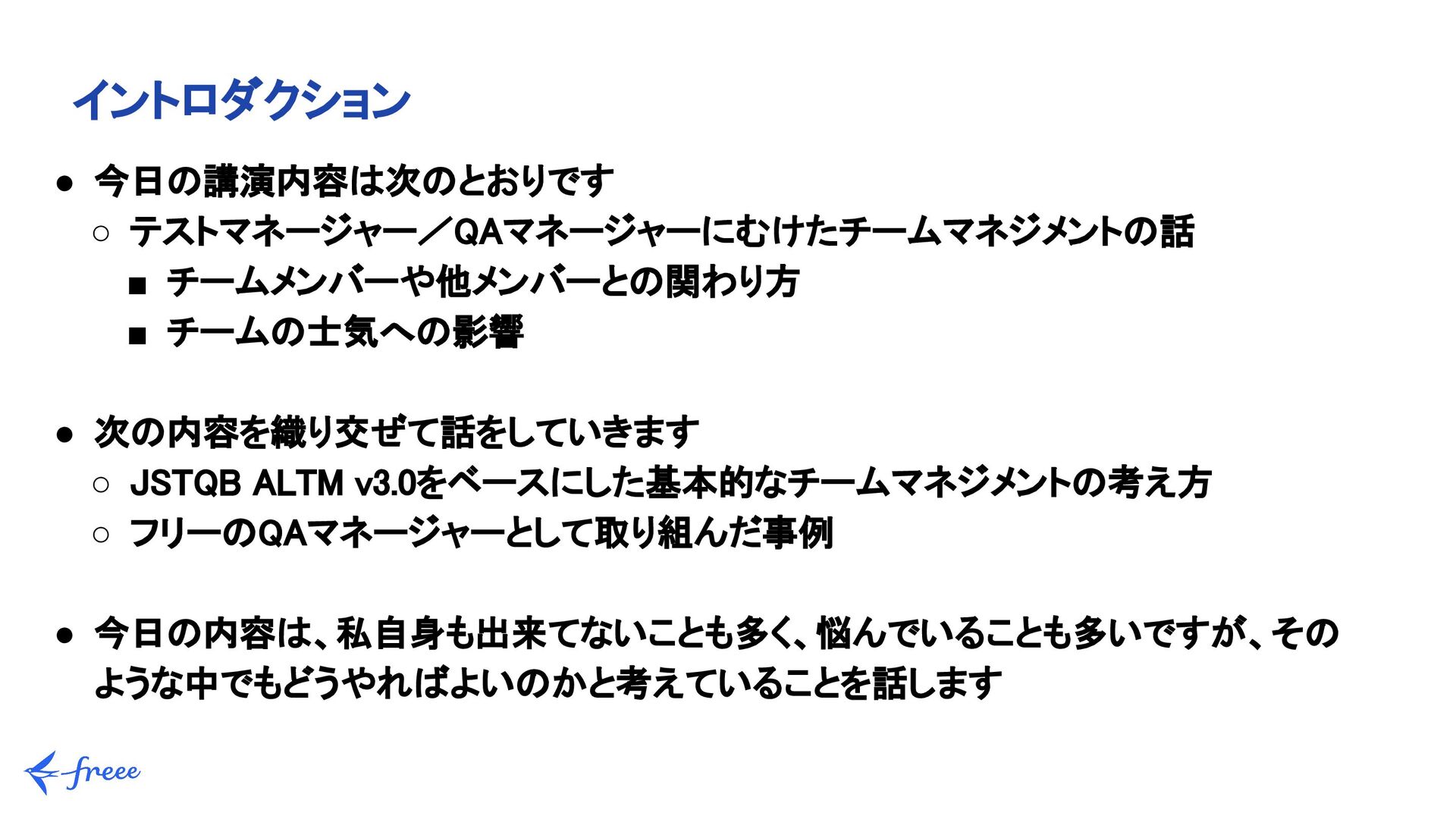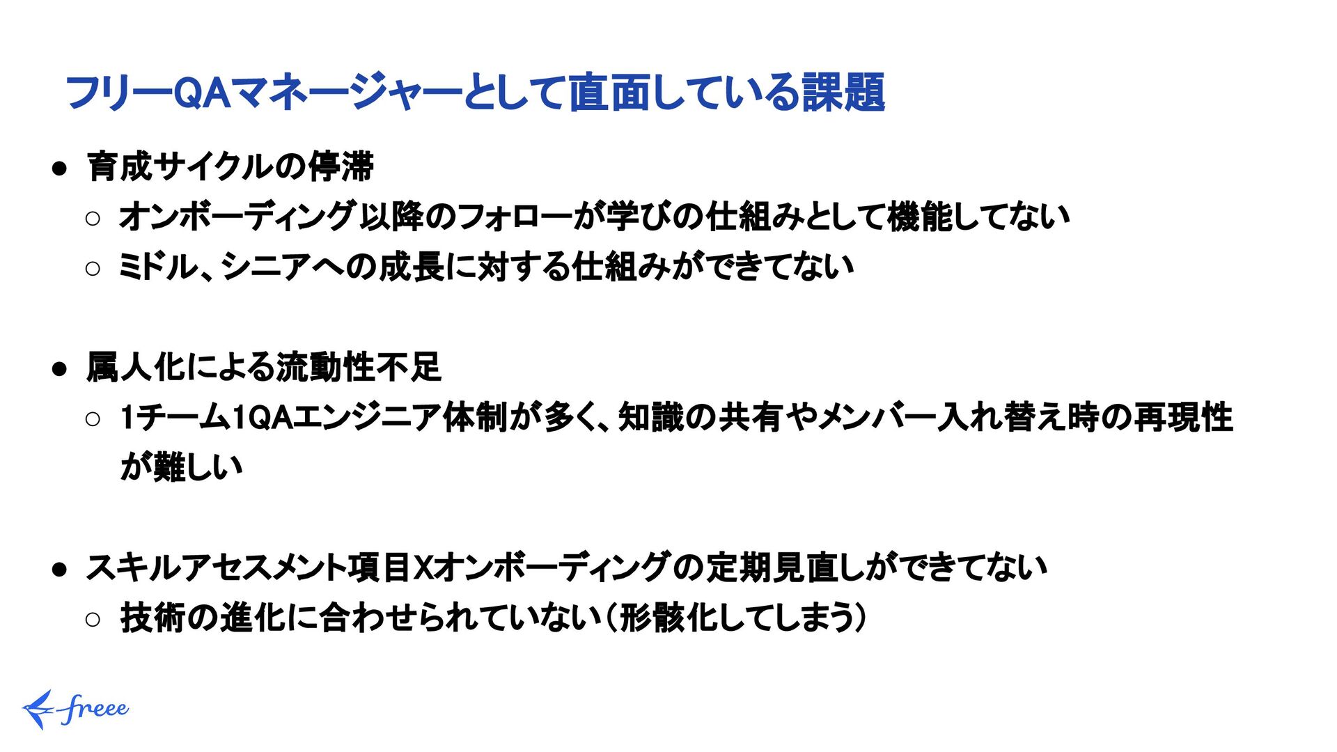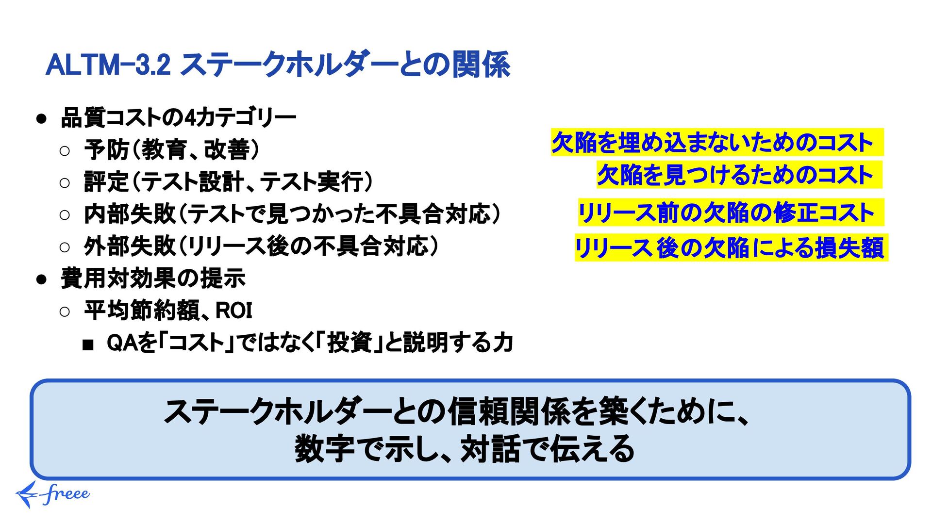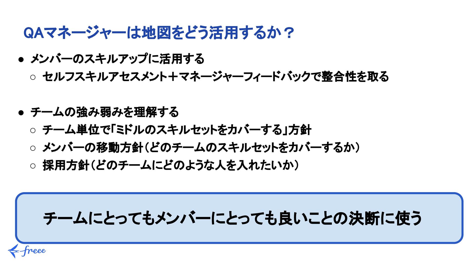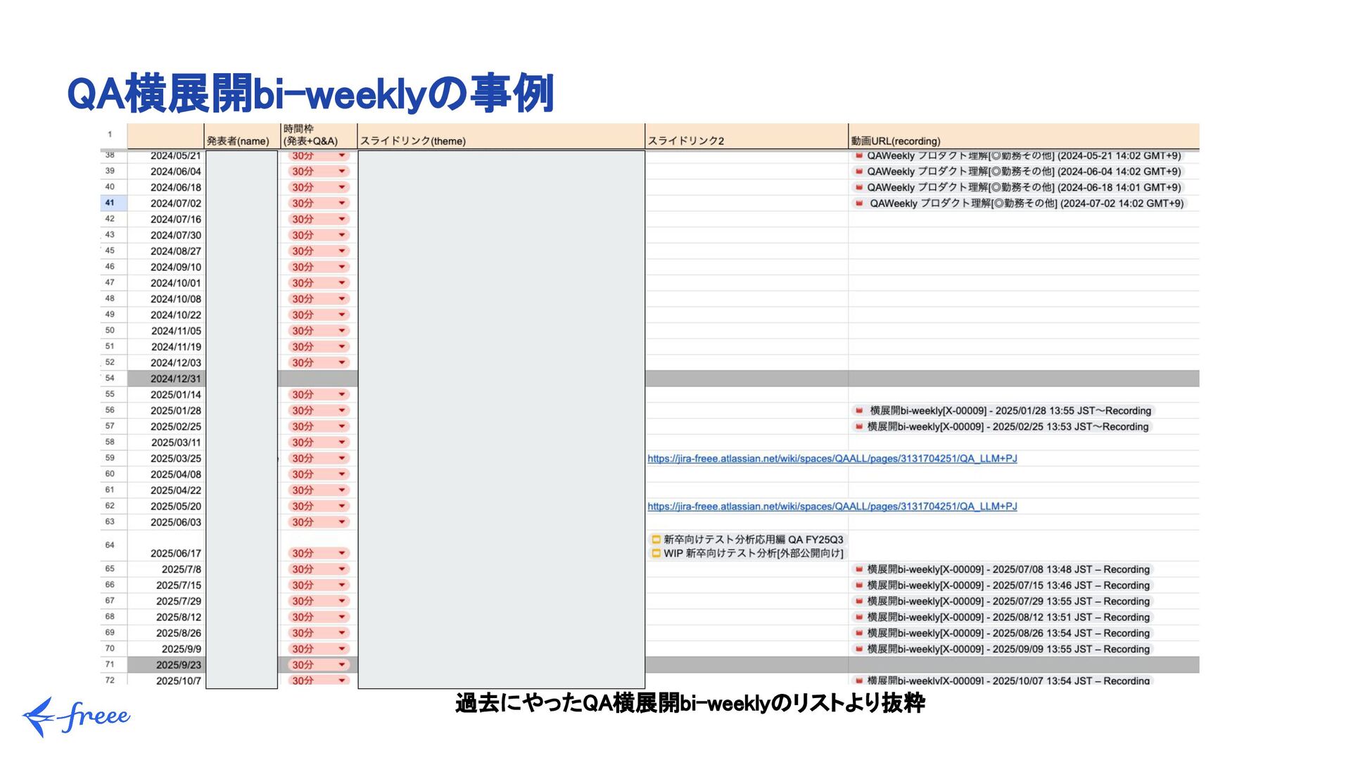 効果測定 振り返り QA テスト フィードバック フィードバック フィードバック フィードバック QAテストも フィードバック の⼀つ ※重篤度:Severity ➢ 事象のひどさであり、ユーザーのもと で発⽣してはいけない度合いを⽰す • リリース頻度が⾼いので、リスクベースドテストを中⼼に⾏っている ◦ 各プロダクト、サービスごとに重篤度:Severity※を定め、開発チーム全体で認識をあわせている ◦ 重篤度が高い事象が起きる可能性(リスク)があるかを話し合い、高いリスクを確実に潰すようにテストする • アジャイル開発しているチームが多く、QAエンジニアも上流⼯程から参加している ◦ QAエンジニアが各開発チームにアサインされているため、企画段階から関わり、さまざまな意見を言い合える環境がある ◦ ドメイン知識のない領域にチャレンジするメンバーも少なくないため、開発チームで勉強会を開催するなど、チームで知識 を高めていく活動も盛ん • リグレッションテストを⾃動化し、QAエンジニアも⾃動テストをコーディングして活⽤し ている ◦ Playwrightなどいくつかのオープンソースを活用してfreee独自のテストフレームワークを構築している もっと速く、 もっと⼿前で!