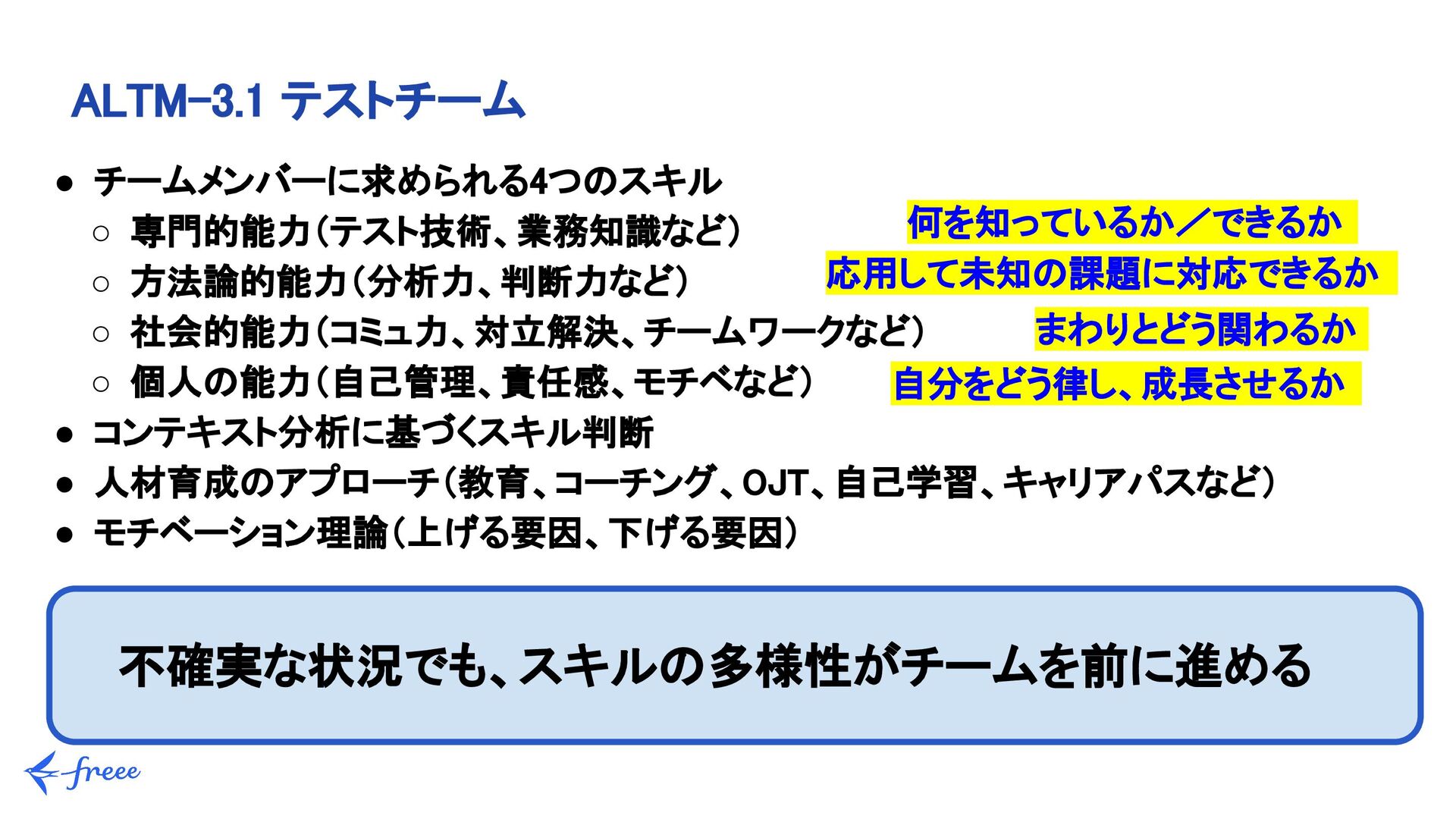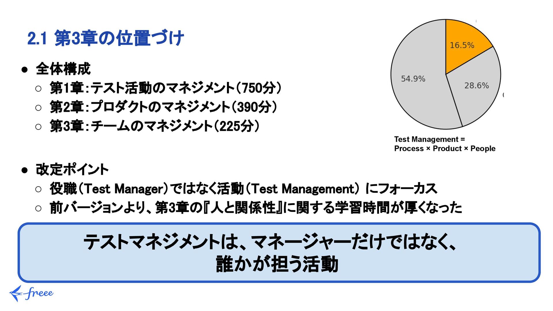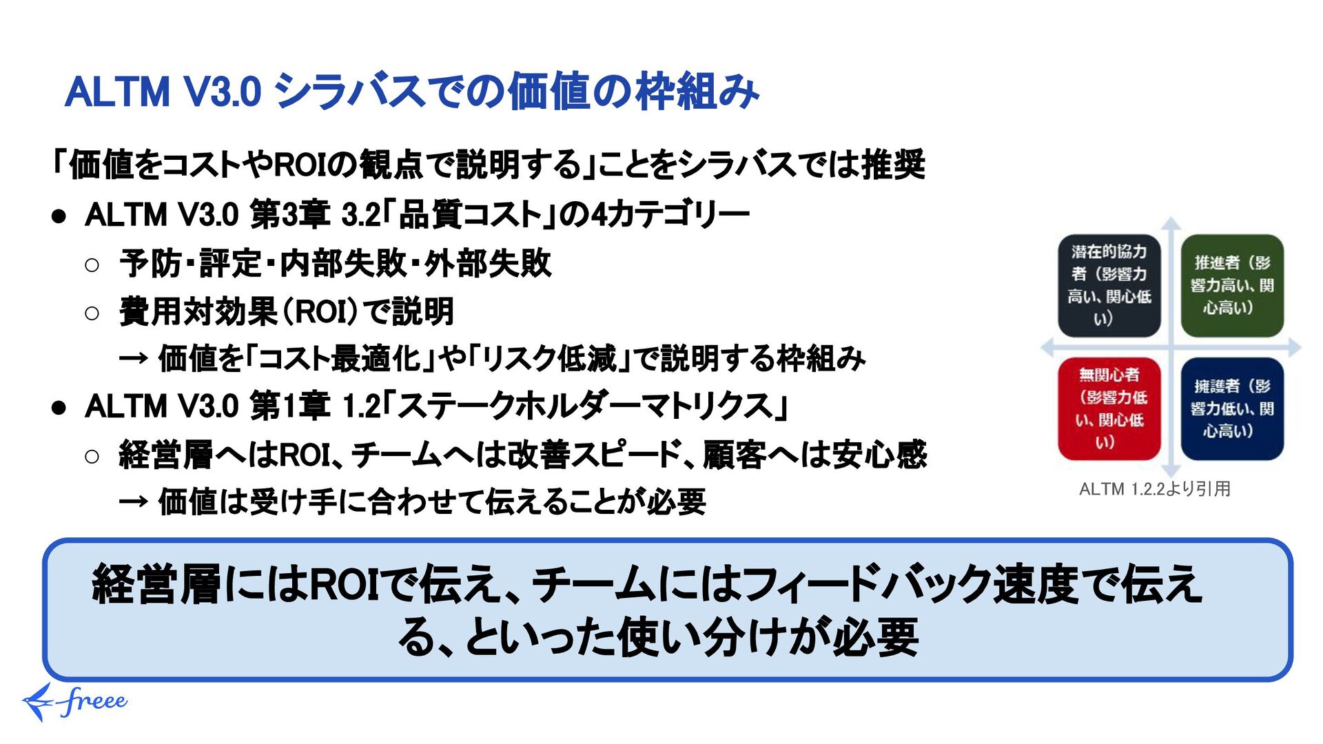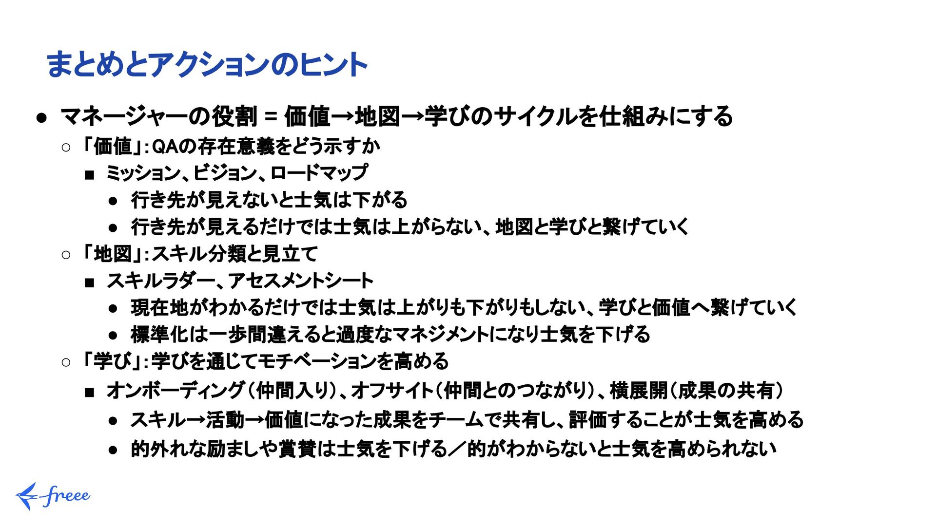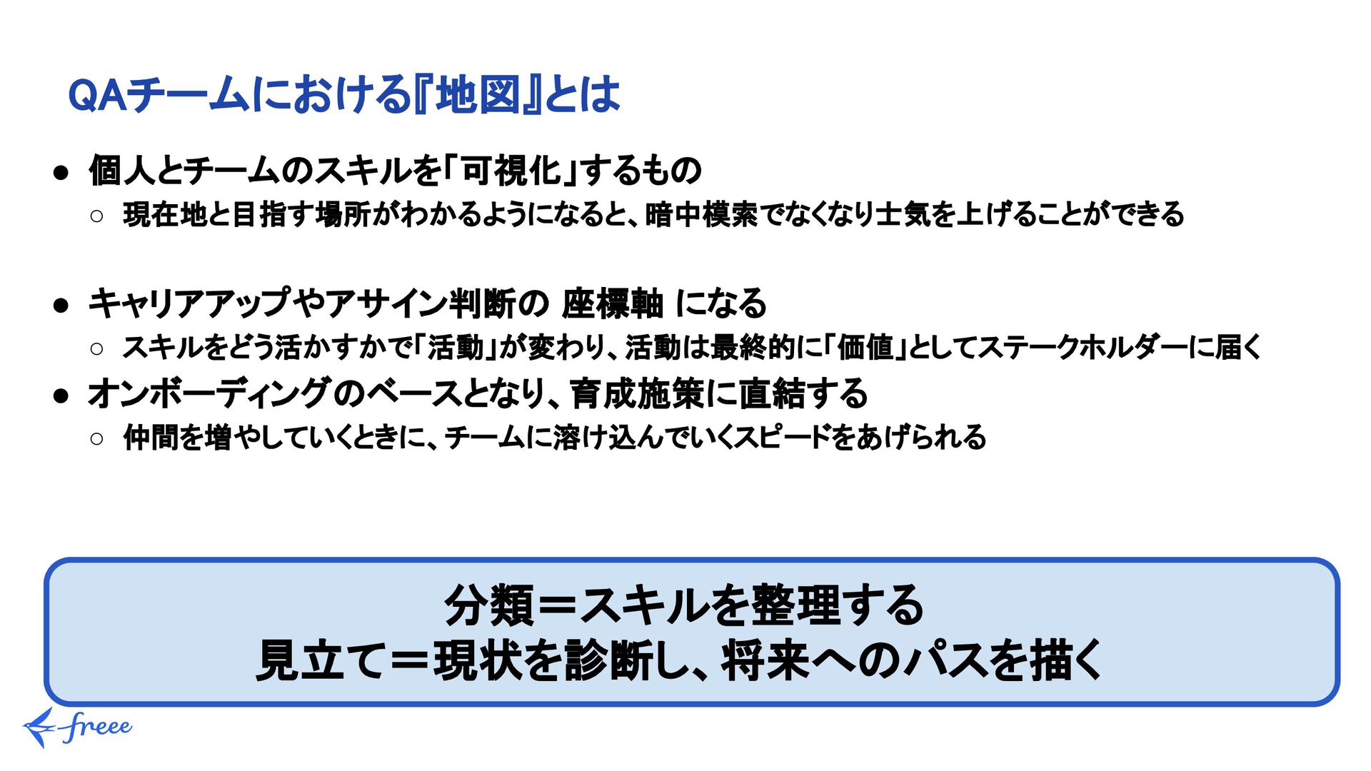 効果測定 振り返り QA テスト フィードバック フィードバック フィードバック フィードバック QAテストも フィードバック の⼀つ ※重篤度:Severity ➢ 事象のひどさであり、ユーザーのもと で発⽣してはいけない度合いを⽰す • リリース頻度が⾼いので、リスクベースドテストを中⼼に⾏っている ◦ 各プロダクト、サービスごとに重篤度:Severity※を定め、開発チーム全体で認識をあわせている ◦ 重篤度が高い事象が起きる可能性(リスク)があるかを話し合い、高いリスクを確実に潰すようにテストする • アジャイル開発しているチームが多く、QAエンジニアも上流⼯程から参加している ◦ QAエンジニアが各開発チームにアサインされているため、企画段階から関わり、さまざまな意見を言い合える環境がある ◦ ドメイン知識のない領域にチャレンジするメンバーも少なくないため、開発チームで勉強会を開催するなど、チームで知識 を高めていく活動も盛ん • リグレッションテストを⾃動化し、QAエンジニアも⾃動テストをコーディングして活⽤し ている ◦ Playwrightなどいくつかのオープンソースを活用してfreee独自のテストフレームワークを構築している もっと速く、 もっと⼿前で!