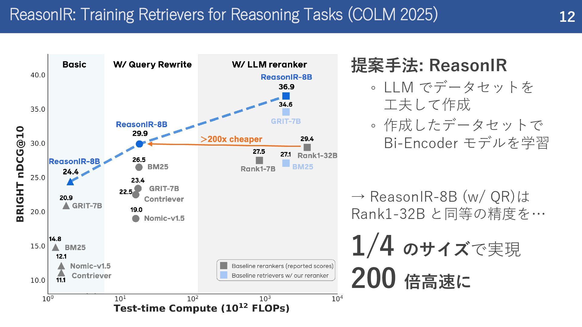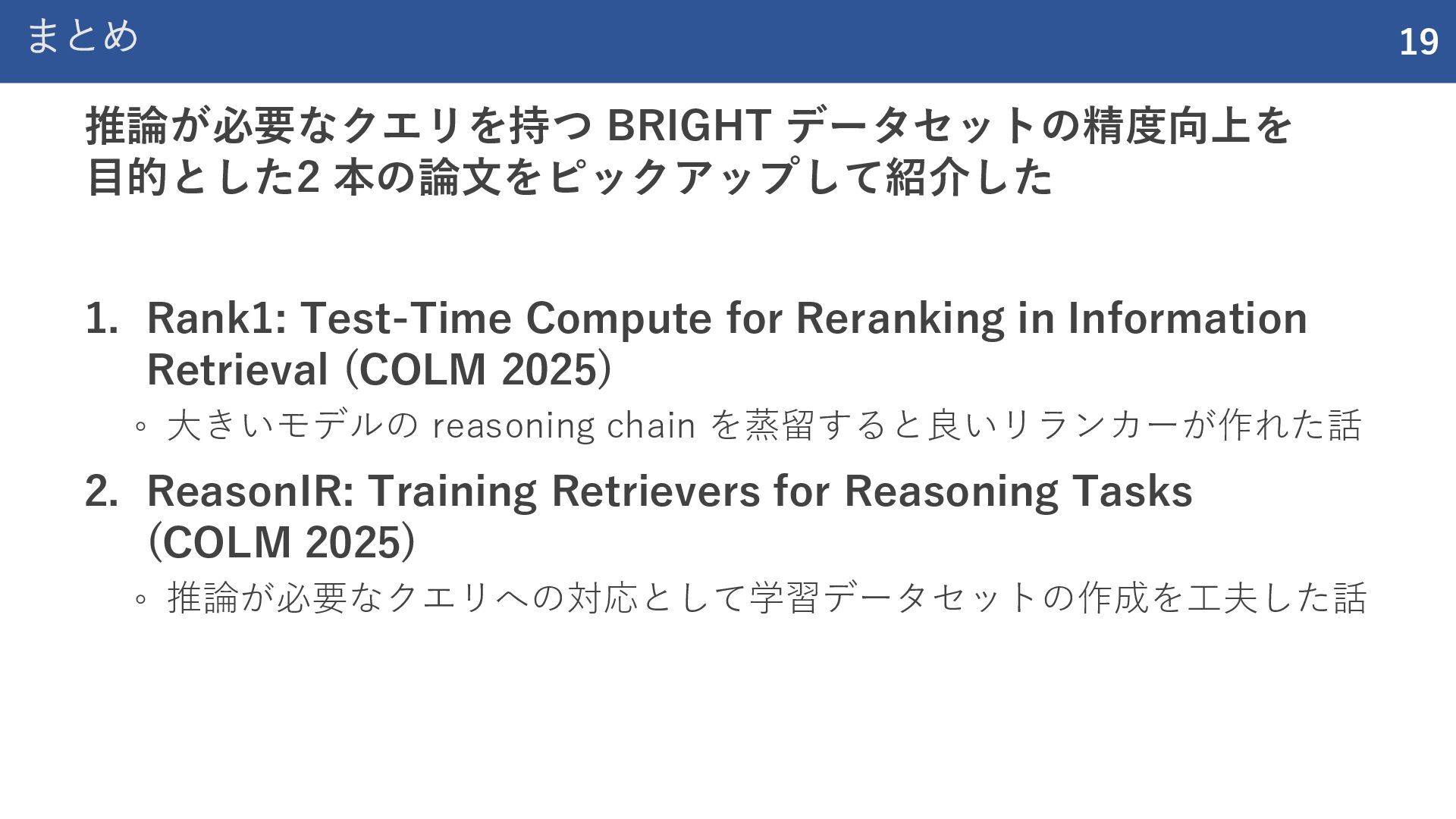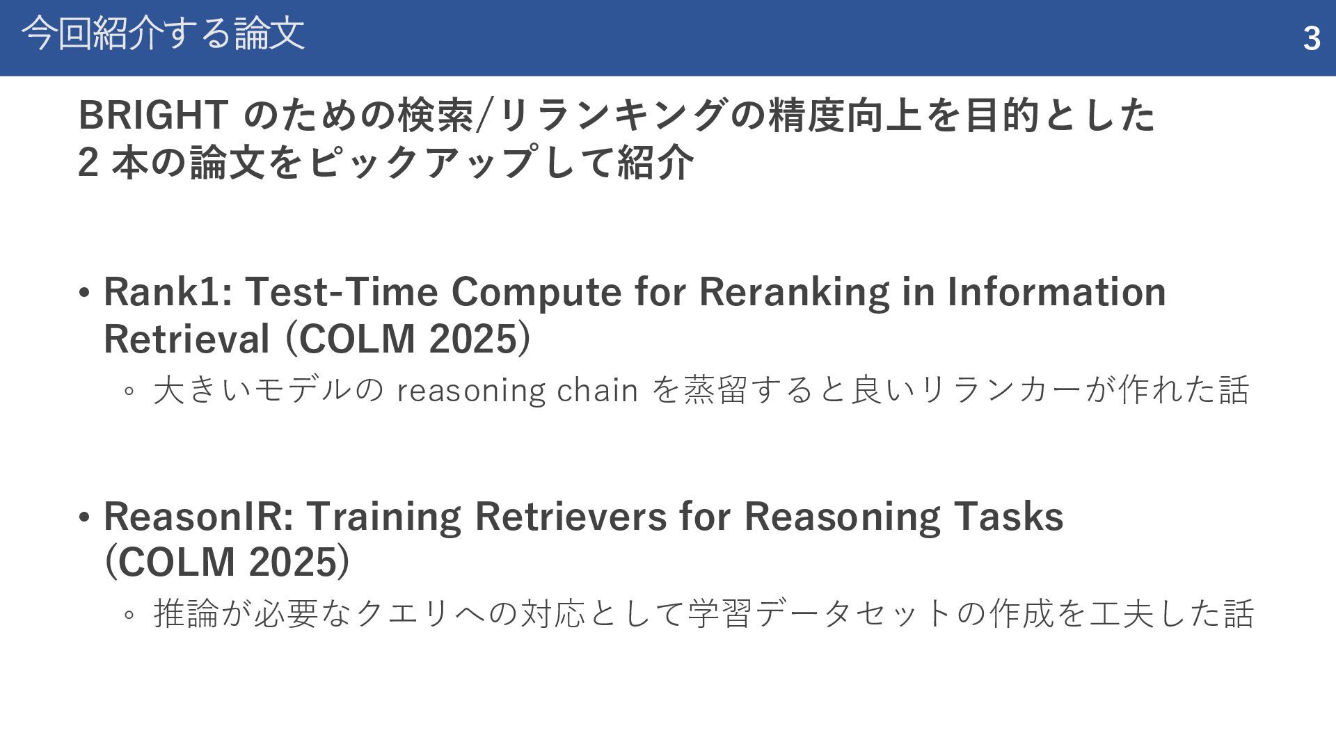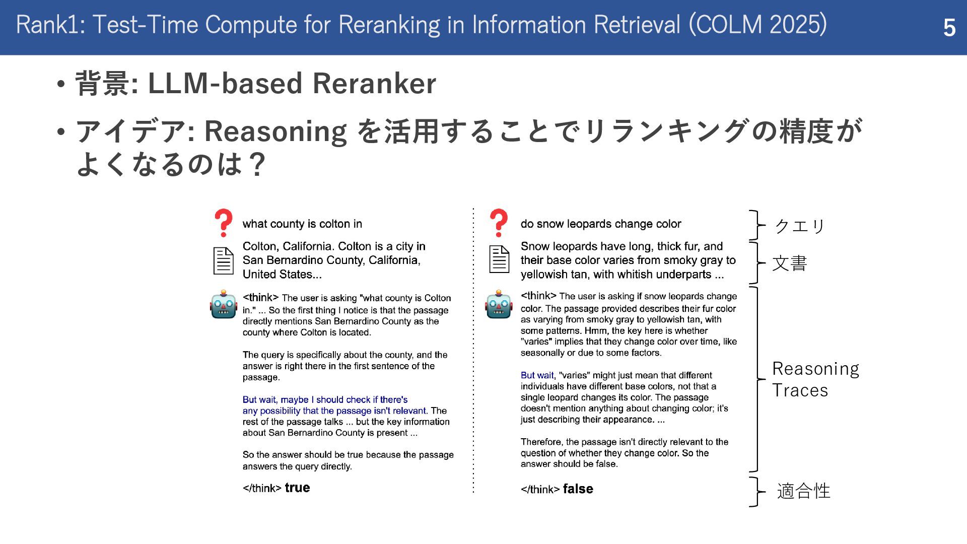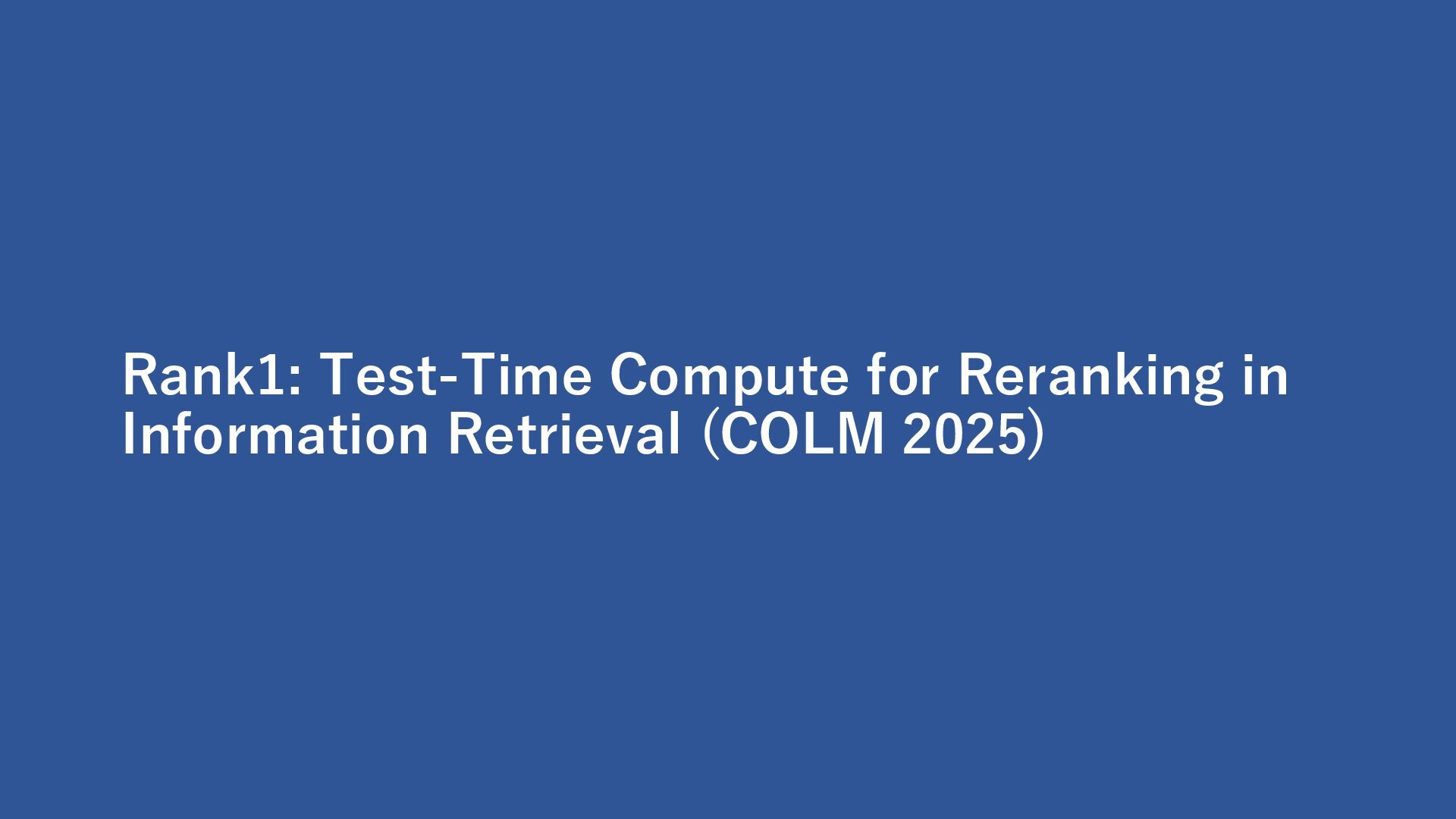 紹介した論文 Rank1: Test-Time Compute for Reranking in Information Retrieval (COLM 2025) ReasonIR: Training Retrievers for Reasoning Tasks (COLM 2025)