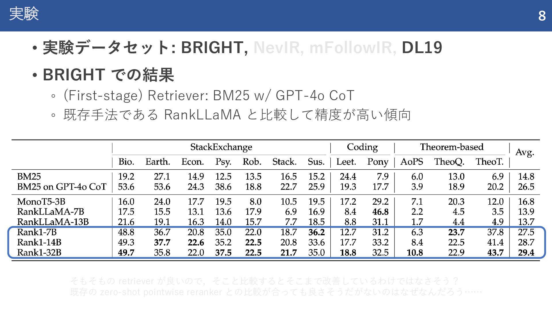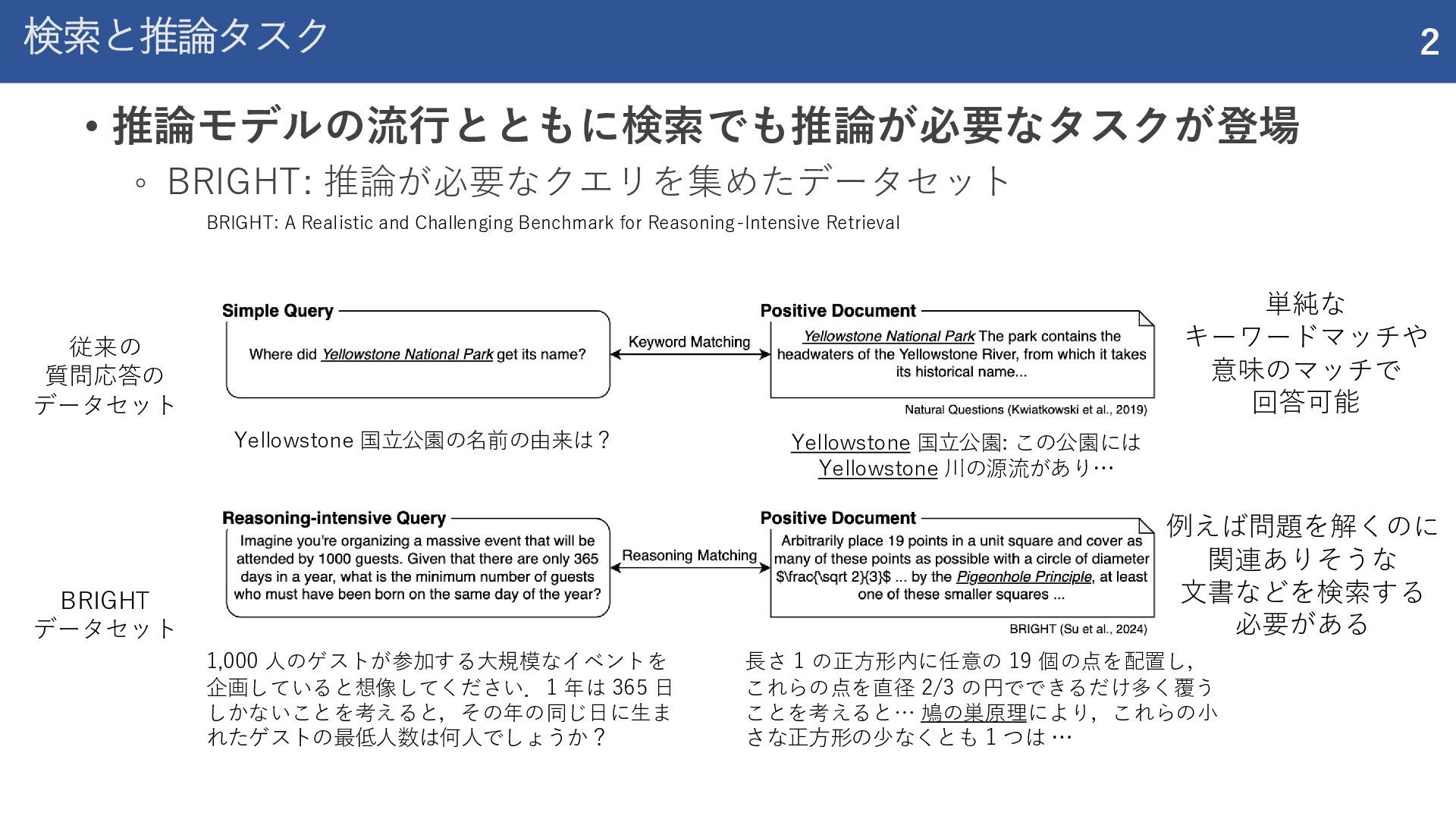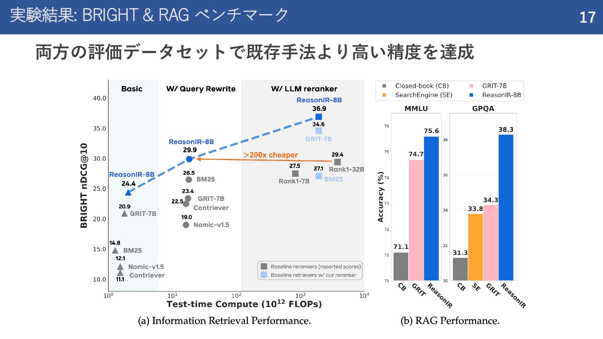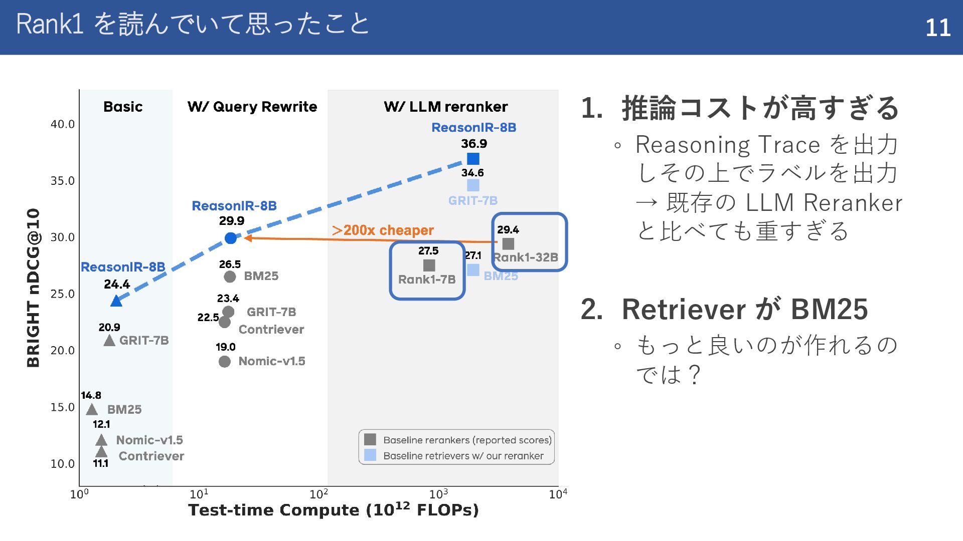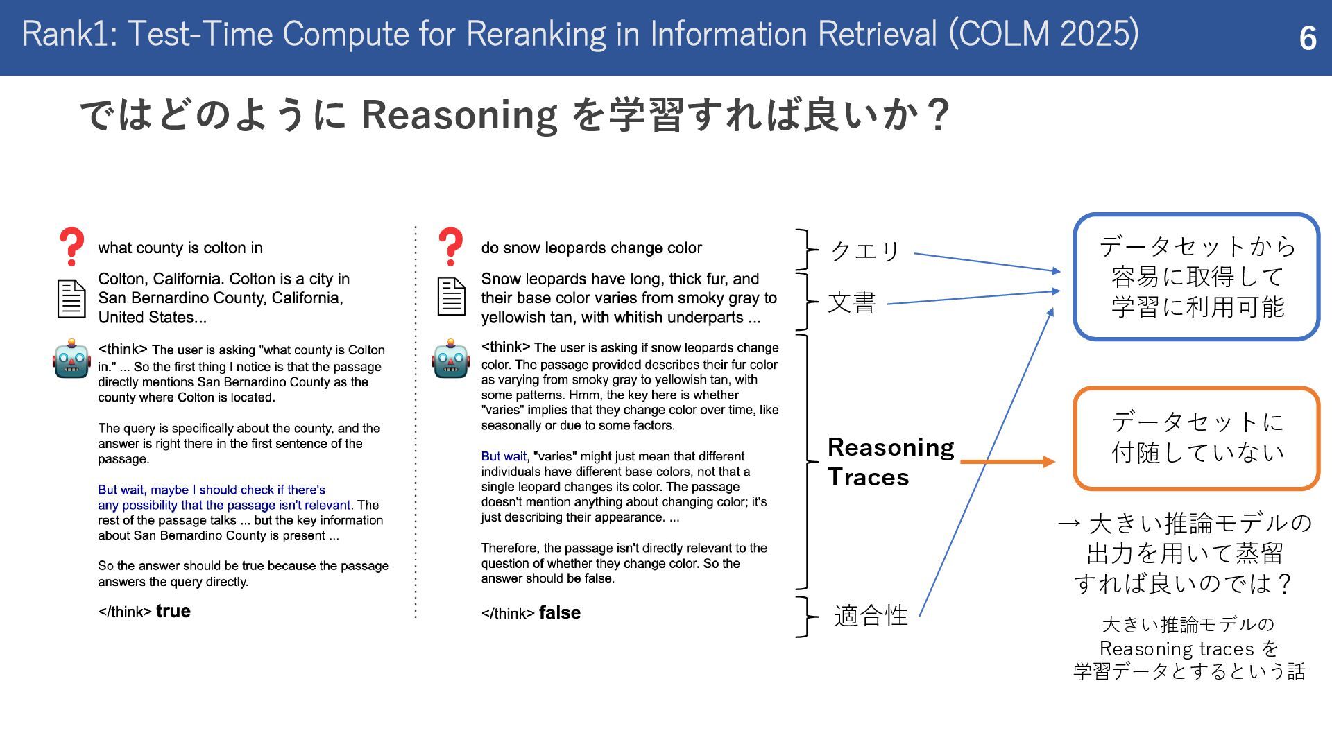 紹介した論文 Rank1: Test-Time Compute for Reranking in Information Retrieval (COLM 2025) ReasonIR: Training Retrievers for Reasoning Tasks (COLM 2025)