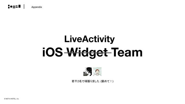自社 (NOT A HOTEL AOSHIMA) で開催した社内ハッカソンの資料です。 iOS ウィジェット作ろうとしたら、その拡張である LiveAcitivity が真のソリューションだったので、その開発にトライしました。 しんどいときは青島の波の音を聴いてリラックスしました。