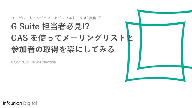 コーポレートエンジニア・カジュアルトーク #2 実例LT G Suite 担当者必見!? GAS を使ってメーリングリストと 参加者の取得を楽にしてみる 6.Sep.2019