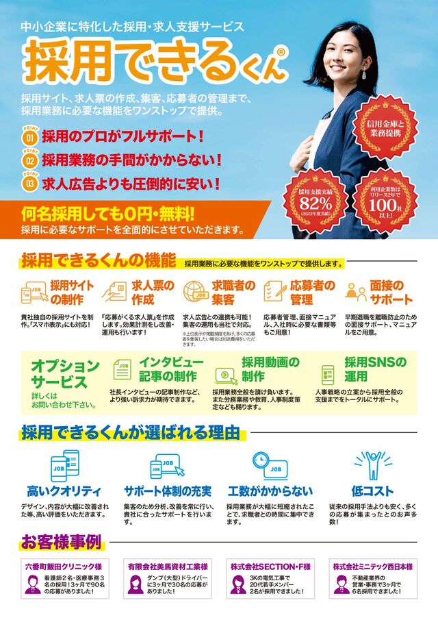 ৴༻ۚݿͱ ۀఏܞ ࠾༻αΠτɺ ٻਓථͷ࡞ɺ ू٬ɺ Ԡืऀͷཧ·Ͱɺ ࠾༻ۀʹඞཁͳػೳΛϫϯετοϓͰఏڙɻ ࠾༻ͷϓϩ͕ϑϧαϙʔτ ʂ ࠾༻ۀͷख͕͔͔ؒΒͳ͍ʂ ٻਓࠂΑΓѹతʹ͍҆ʂ ࠾༻Ͱ͖Δ͘Μ͕બΕΔཧ༝ ߴ͍ΫΦϦςΟ σβΠϯɺ ༰͕େ෯ʹվળ͞Ε ͨɺ ߴ͍ධՁΛ͍͖ͨͩ·͢ɻ αϙʔτମ੍ͷॆ࣮ ू٬ͷͨΊੳɺ վળΛৗʹߦ͍ɺ وࣾʹ߹ͬͨαϙʔτΛߦ͍· ͢ɻ ͕͔͔Βͳ͍ ࠾༻ۀ͕େ෯ʹॖ͞Εͨ͜ ͱͰɺ ٻ৬ऀͱͷ࣌ؒʹूதͰ͖ ·͢ɻ ίετ ैདྷͷ࠾༻ख๏ΑΓ҆͘ɺ ଟ͘ ͷԠื͕ू·ͬͨͱͷ͓ଟ ʂ Կ໊࠾༻ͯ̌͠ԁ ɾ ແྉ ࠾༻ʹඞཁͳαϙʔτΛશ໘తʹ͍͖ͤͯͨͩ͞·͢ɻ ͓٬༷ࣄྫ ޢࢣ໊̎ ɾ ҩྍࣄ̏ ໊ͷ࠾༻ʂϲ݄Ͱ໊ ͷԠื͕͋Γ·ͨ͠ ʂ ൪ொ൧ాΫϦχοΫ༷ μϯϓ ʢେܕʣ υϥΠόʔ ʹϲ݄Ͱ໊ͷԠื͕ ͋Γ·ͨ͠ ʂ ༗ݶձࣾඒഅࢿࡐۀ༷ ,ͷిؾࣄͰ एखϝϯόʔ ໊͕࠾༻Ͱ͖·ͨ͠ ʂ גࣜձࣾ4&$5*0/ ɾ '༷ ෆಈ࢈ۀքͷ Ӧۀ ɾ ࣄͰϲ݄Ͱ ໊࠾༻Ͱ͖·ͨ͠ ʂ גࣜձࣾϛχςοΫຊ༷ தখاۀʹಛԽͨ͠࠾༻ ɾ ٻਓࢧԉαʔϏε 01 02 03 ࠾༻Ͱ͖Δ͘Μͷػೳ ࠾༻ۀʹඞཁͳػೳΛϫϯετοϓͰఏڙ͠·͢ɻ ࠾༻αΠτ ͷ੍࡞ وࣾಠࣗͷ࠾༻αΠτΛ੍ ࡞ɻ ʮεϚϗදࣔʯ ʹରԠ ʂ ٻਓථͷ ࡞ ʰԠื͕͘Δٻਓථʱ Λ࡞ ͠·͢ɻ ޮՌܭଌΛ͠վળŋ ӡ༻ߦ͍·͢ ʂ ٻ৬ऀͷ ू٬ ٻਓࠂͱͷ࿈ܞՄೳʂ ू٬ͷӡ༻ࣾͰରԠɻ Ԡืऀͷ ཧ ໘ͷ αϙʔτ Ԡืऀཧɺ ໘ϚχϡΞ ϧɺ ೖࣾ࣌ʹඞཁͳॻྨ ͝༻ҙ ʂ ૣظୀ৬Λ৬ࢭͷͨΊ ͷ໘αϙʔτɺ ϚχϡΞ ϧΛ͝༻ҙɻ ˞্ҐදࣔܝࡌසΛ͋͛ɺ ଟ͘ ͷԠื ऀΛू٬͍ͨ͠߹ผ్අ༻Λ͍ͨͩ ͖·͢ɻ ΠϯλϏϡʔ هࣄͷ੍࡞ ࣾΠϯλϏϡʔͷهࣄ੍࡞ͳͲɺ ΑΓڧ͍ૌٻྗ͕ظͰ͖·͢ɻ ࠾༻ಈըͷ ੍࡞ ࠾༻ۀશൠΛ͚ෛ͍·͢ɻ ·ͨ࿑ۀڭҭɺ ਓࣄ੍ࡦ ఆͳͲࣀΓ·͢ɻ ࠾༻4/4ͷ ӡ༻ ਓࣄઓུͷཱҊ͔Β࠾༻શൠͷ ࢧԉ·ͰΛτʔλϧʹαϙʔτɻ Φϓγϣϯ αʔϏε ৄ͘͠ ͓͍߹ΘͤԼ͍͞ɻ