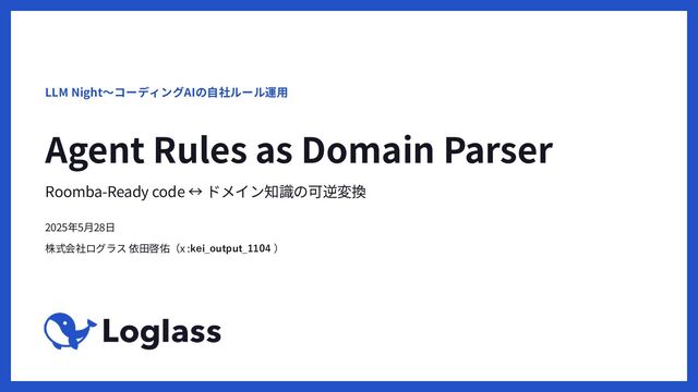 ドメイン知識の Single Source of Truth としての コード (ここだけ永続 化) 3重メンテせず、 都度ビューとして 復元 Parserあるいは 関手としての Agent Rule Gap: 2.1 構造化されたエンコード を強制したい Gap1.2 半構造化されていて欲しい 2.2 コードが知識を表明していて欲しい 3.2 二重メンテしたくない Gap 3.1コード=最新仕様 から 復元したい 3.2 二重メンテしたくない それぞれ半構造化され た空テンプレ/サンプル だけ用意 Gap1.2 半構造化されていて欲しい