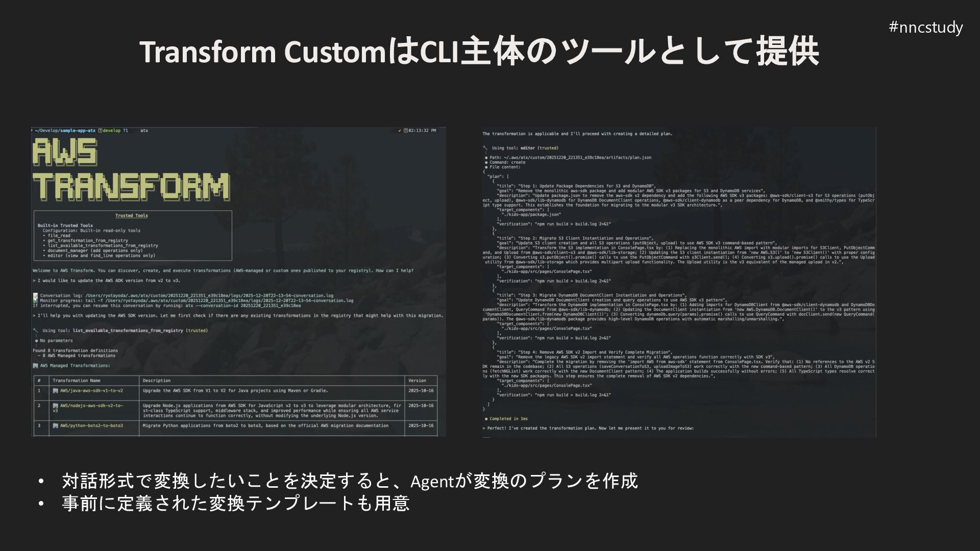 Transform CustomはCLI主体のツールとして提供 • 対話形式で変換したいことを決定すると、Agentが変換のプランを作成 • 事前に定義された変換テンプレートも用意 #nncstudy