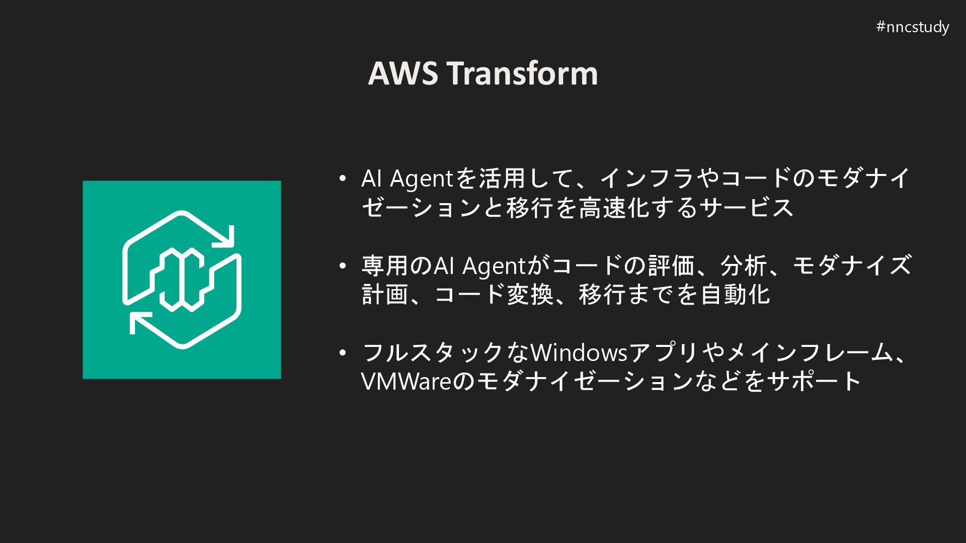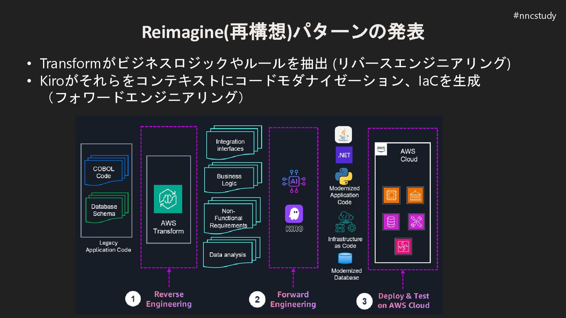 Reimagine(再構想)パターンの発表 • Transformがビジネスロジックやルールを抽出 (リバースエンジニアリング) • Kiroがそれらをコンテキストにコードモダナイゼーション、IaCを生成 (フォワードエンジニアリング) #nncstudy