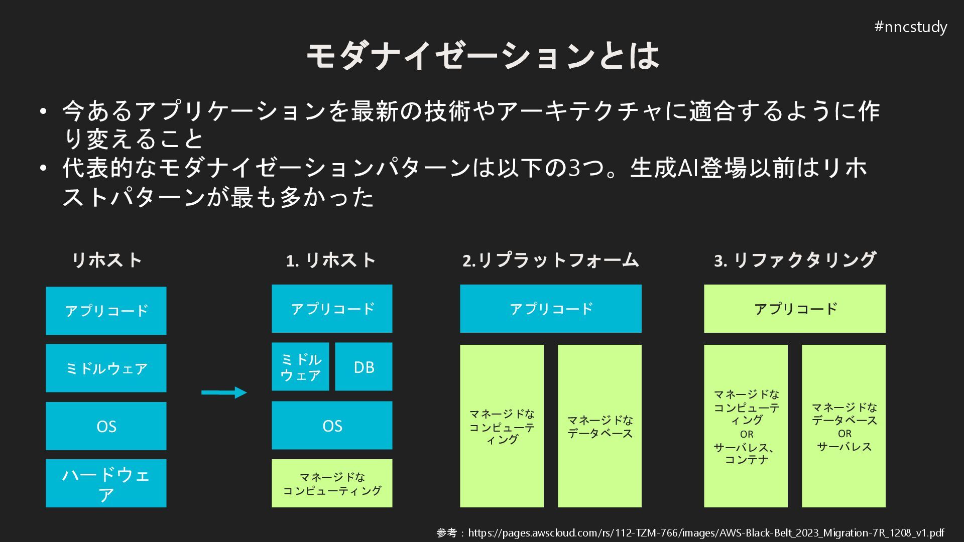 1. リホスト ミドル ウェア アプリコード OS ミドルウェア アプリコード ハードウェ ア 2.リプラットフォーム マネージドな コンピューテ ィング アプリコード DB マネージドな データベース 3. リファクタリング マネージドな コンピューテ ィング OR サーバレス、 コンテナ アプリコード マネージドな データベース OR サーバレス リホスト 参考:https://pages.awscloud.com/rs/112-TZM-766/images/AWS-Black-Belt_2023_Migration-7R_1208_v1.pdf #nncstudy