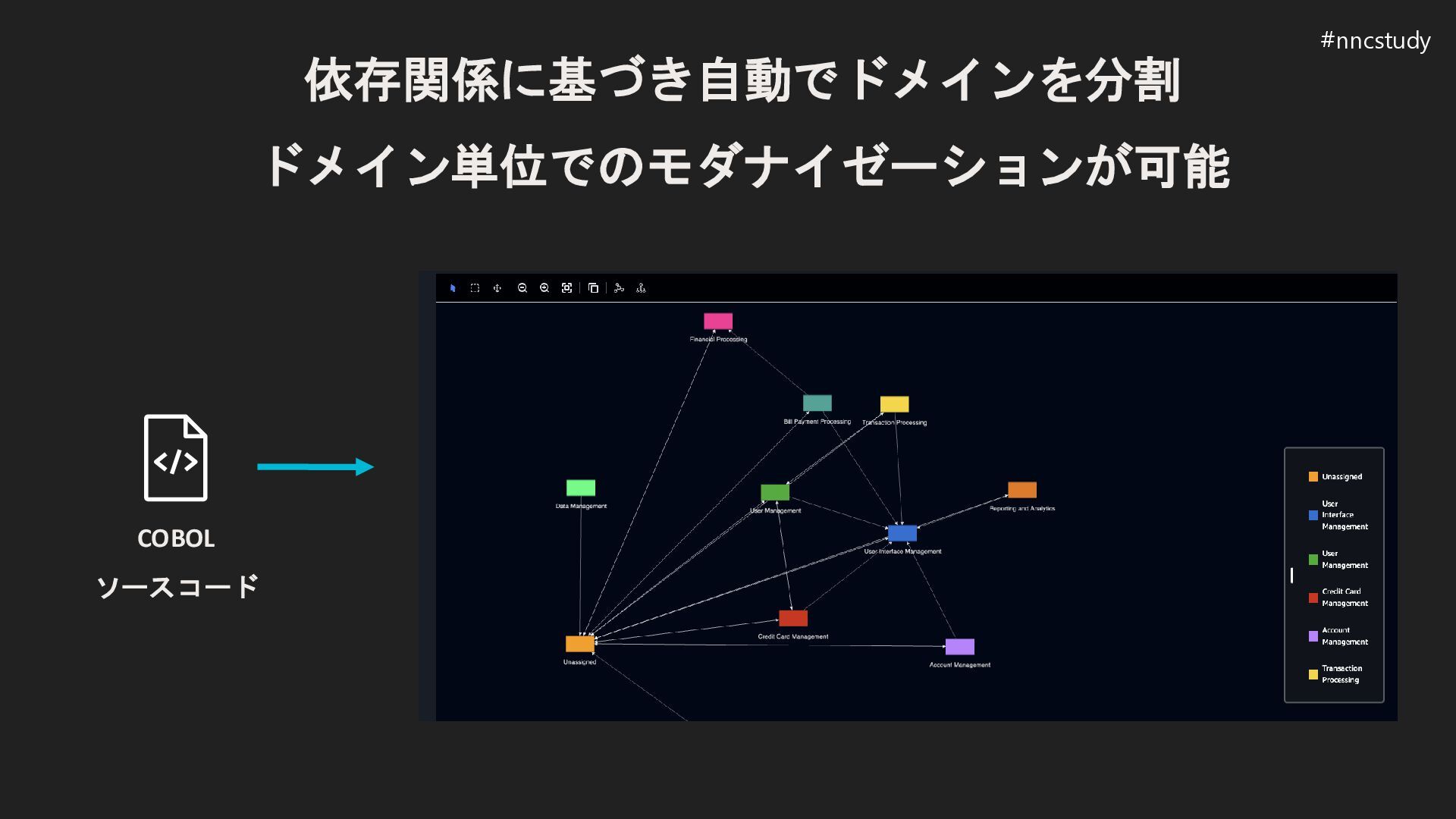依存関係に基づき自動でドメインを分割 ドメイン単位でのモダナイゼーションが可能 COBOL ソースコード #nncstudy