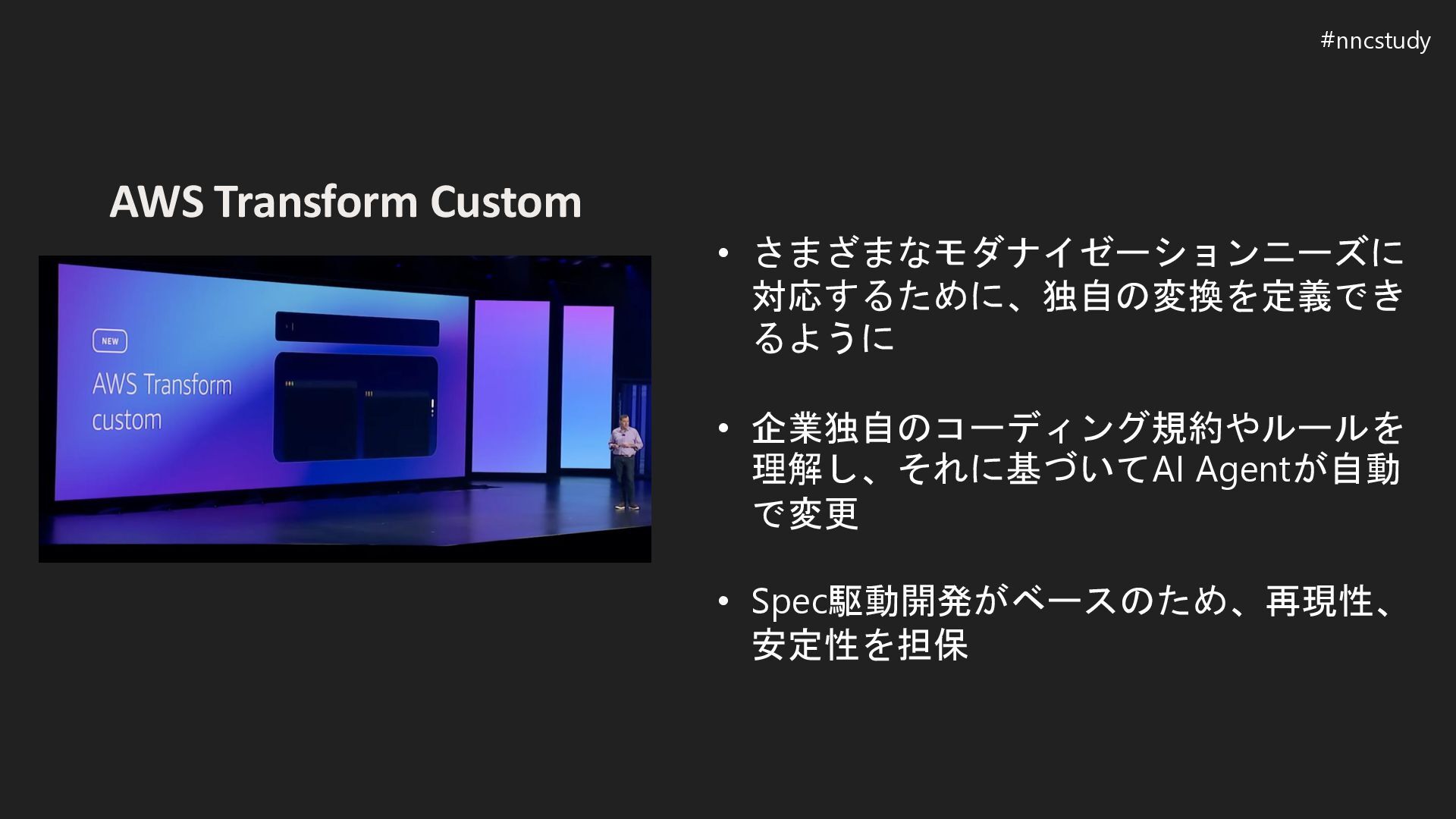 Agent を活用しつつも、背後では仕様駆動・リバース/フォワード エンジニアリングを組み合わせたアプローチを採用 変換の柔軟性を高めながら、安全性と再現性を担保し、実用的なリファクタリ ングが可能に • 「You build it, you own it」 AIが生成したコードに対して、人間の厳格なコードレビューは依然として重要 (Werner CTOのKeynoteより) #nncstudy