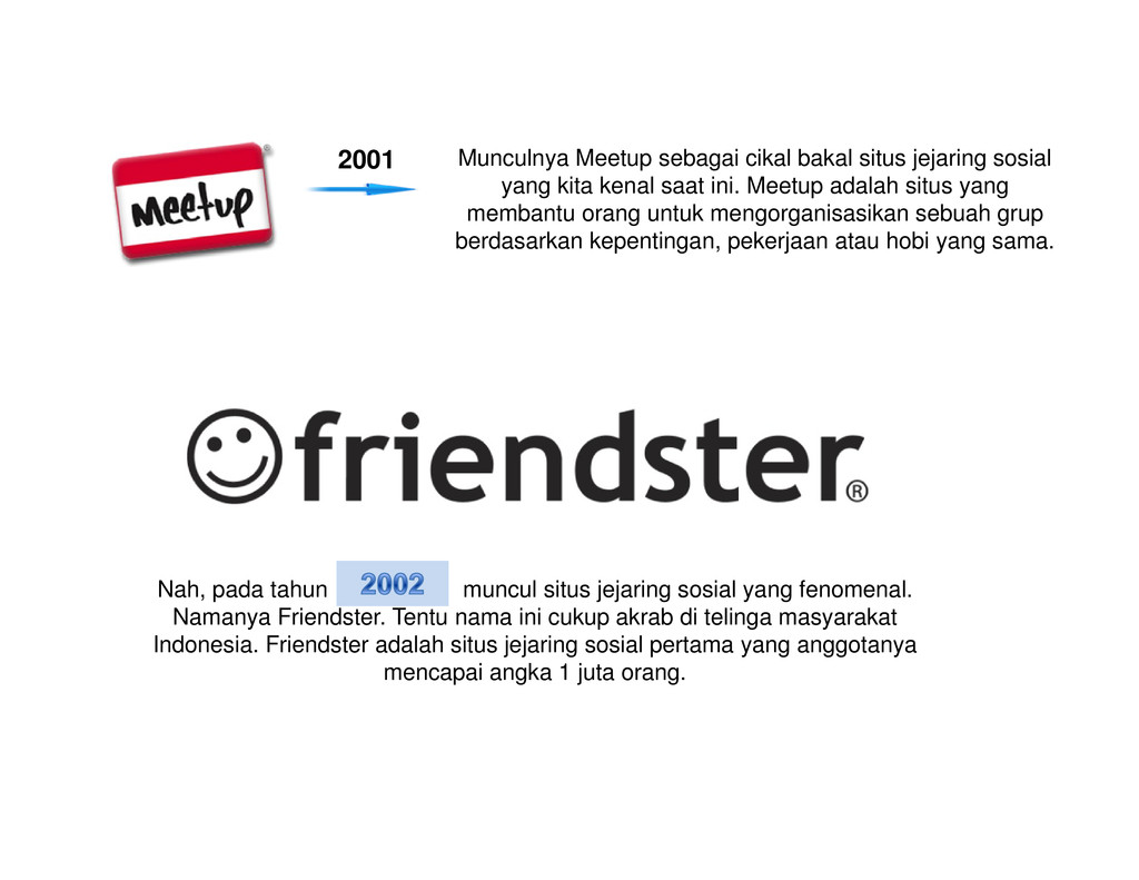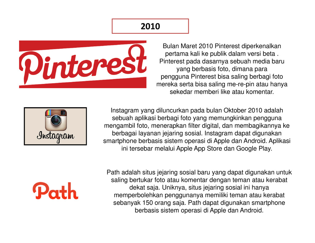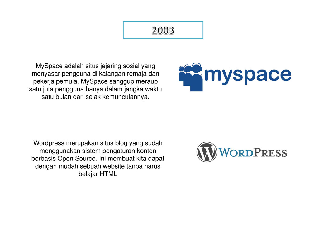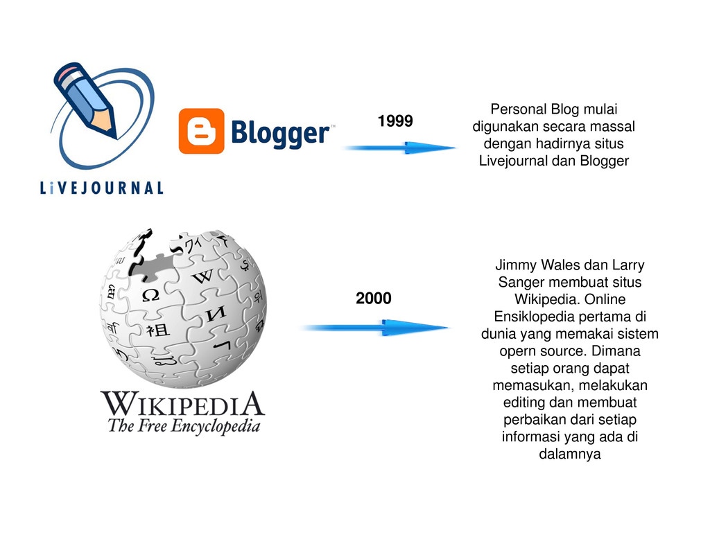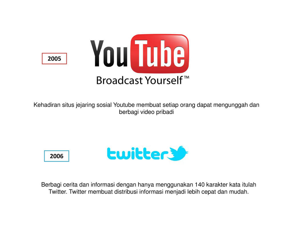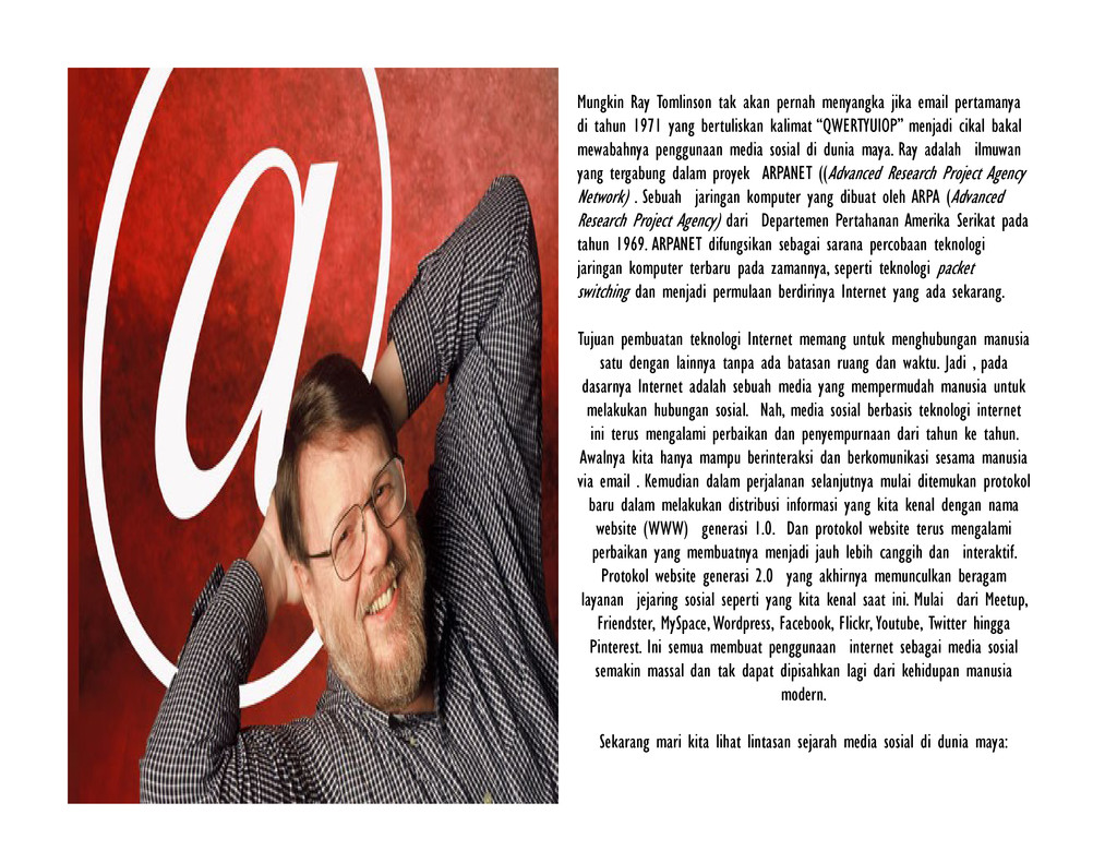 di tahun 1971 yang bertuliskan kalimat “QWERTYUIOP” menjadi cikal bakal mewabahnya penggunaan media sosial di dunia maya. Ray adalah ilmuwan yang tergabung dalam proyek ARPANET ((Advanced Research Project Agency Network) . Sebuah jaringan komputer yang dibuat oleh ARPA (Advanced Research Project Agency) dari Departemen Pertahanan Amerika Serikat pada tahun 1969. ARPANET difungsikan sebagai sarana percobaan teknologi jaringan komputer terbaru pada zamannya, seperti teknologi packet switching dan menjadi permulaan berdirinya Internet yang ada sekarang. Tujuan pembuatan teknologi Internet memang untuk menghubungan manusia satu dengan lainnya tanpa ada batasan ruang dan waktu. Jadi , pada dasarnya Internet adalah sebuah media yang mempermudah manusia untuk melakukan hubungan sosial. Nah, media sosial berbasis teknologi internet ini terus mengalami perbaikan dan penyempurnaan dari tahun ke tahun. Awalnya kita hanya mampu berinteraksi dan berkomunikasi sesama manusia via email . Kemudian dalam perjalanan selanjutnya mulai ditemukan protokol baru dalam melakukan distribusi informasi yang kita kenal dengan nama website (WWW) generasi 1.0. Dan protokol website terus mengalami perbaikan yang membuatnya menjadi jauh lebih canggih dan interaktif. Protokol website generasi 2.0 yang akhirnya memunculkan beragam layanan jejaring sosial seperti yang kita kenal saat ini. Mulai dari Meetup, Friendster, MySpace, Wordpress, Facebook, Flickr, Youtube, Twitter hingga Pinterest. Ini semua membuat penggunaan internet sebagai media sosial semakin massal dan tak dapat dipisahkan lagi dari kehidupan manusia modern. Sekarang mari kita lihat lintasan sejarah media sosial di dunia maya: