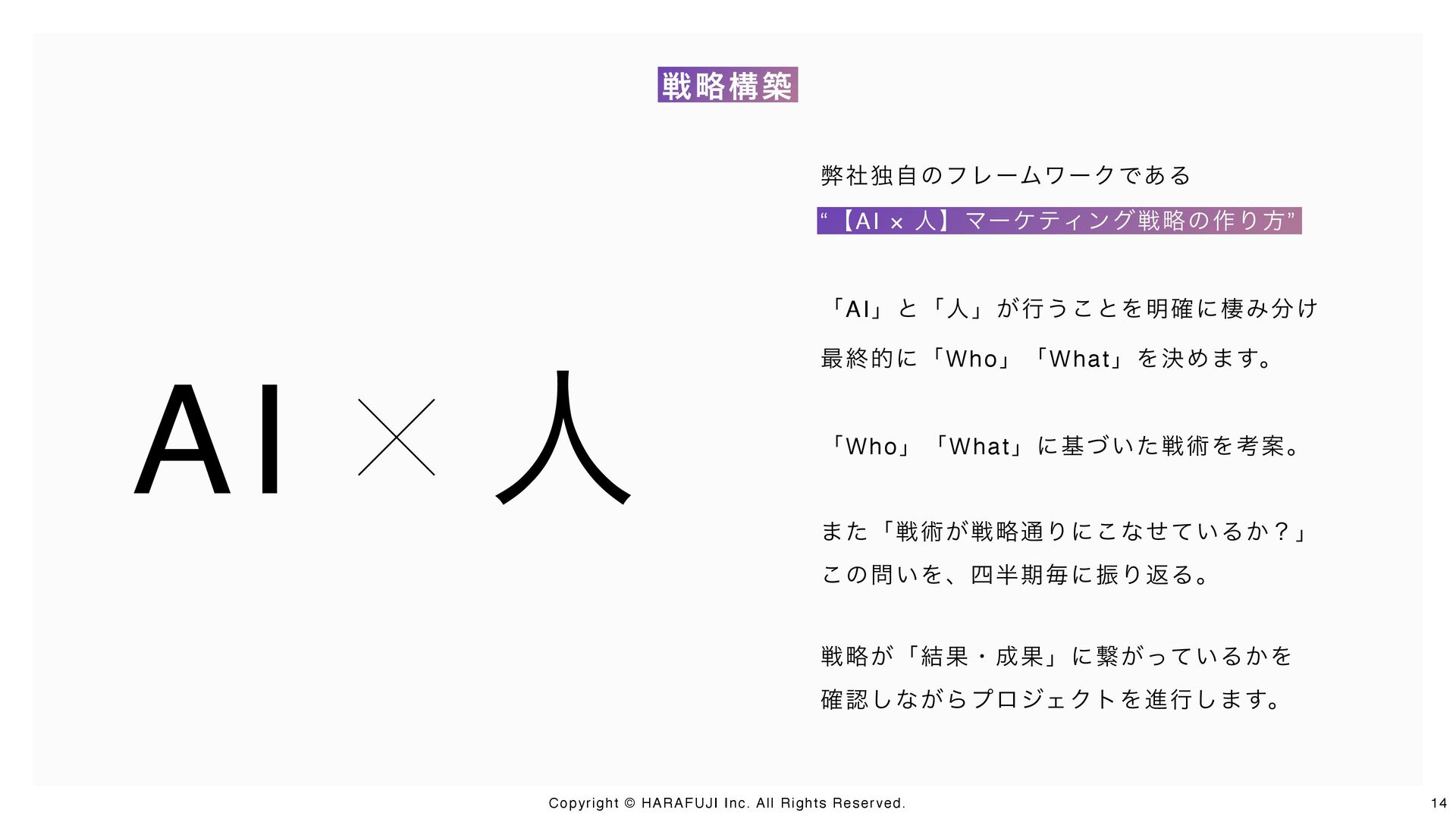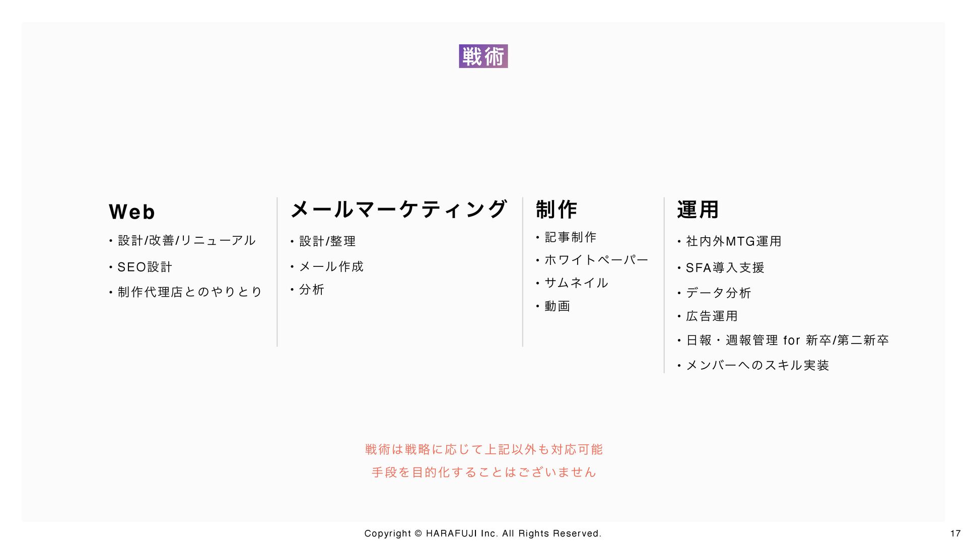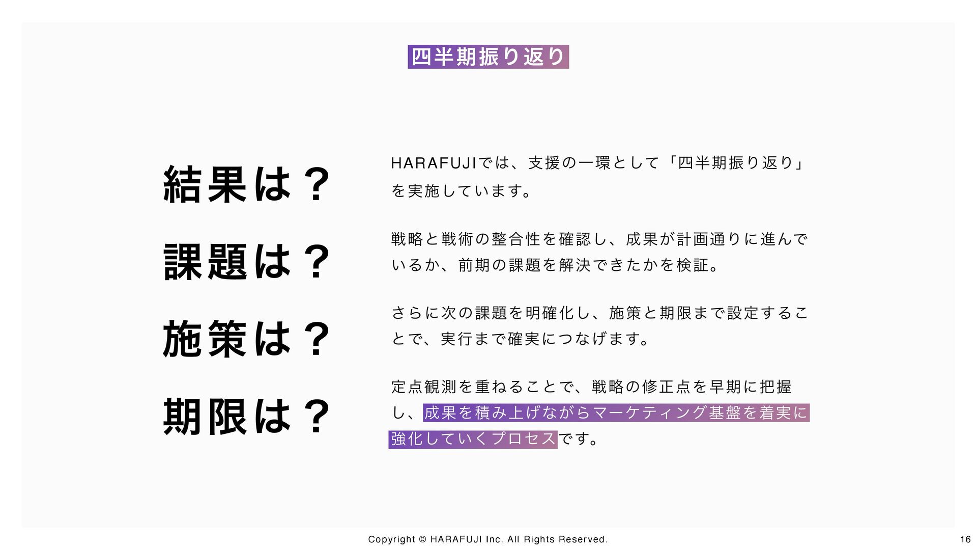 戦略設計から戦術実行、仕組み化・内製化までを一気通貫で支援するのがHARAFUJIの特徴です。