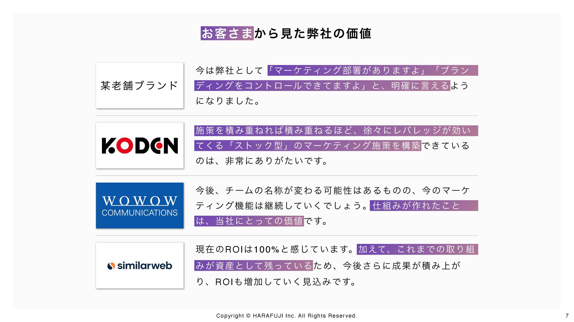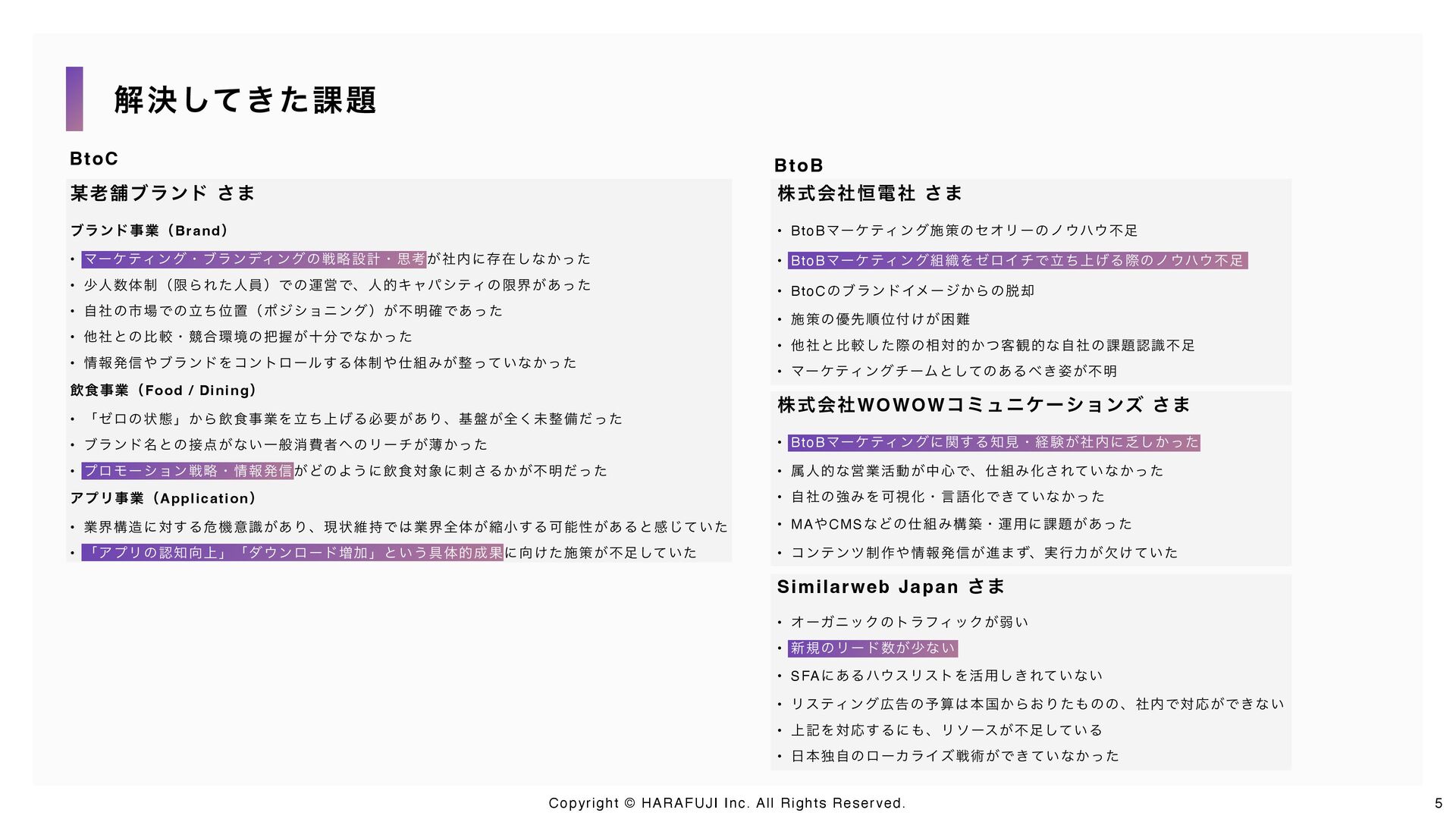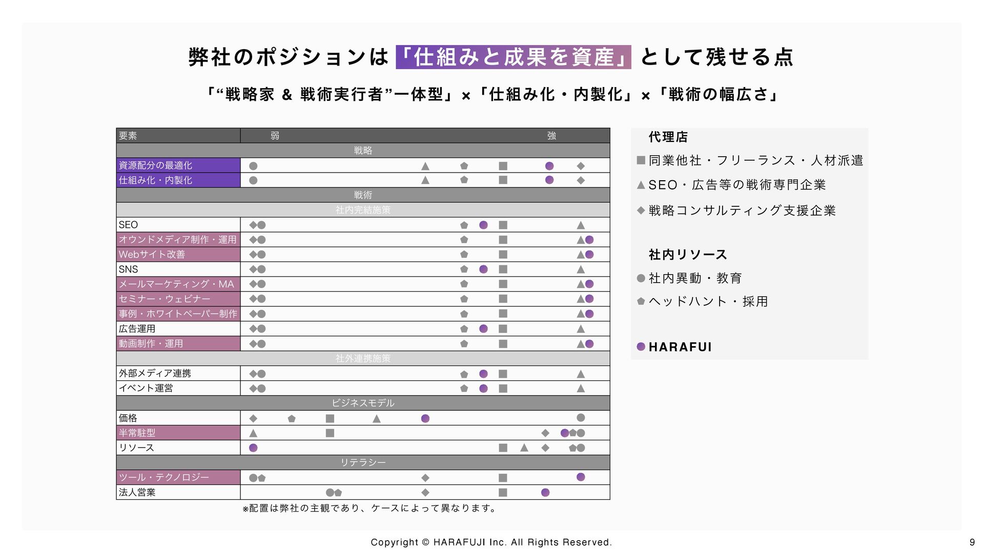 戦略設計から戦術実行、仕組み化・内製化までを一気通貫で支援するのがHARAFUJIの特徴です。