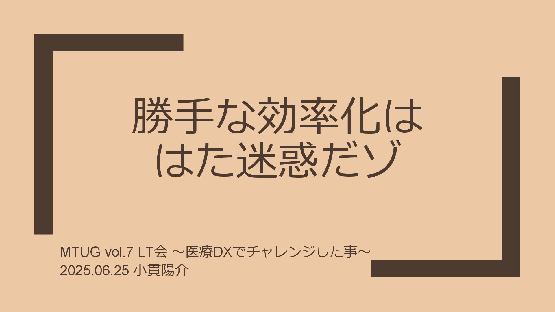 勝手な効率化は はた迷惑だゾ MTUG vol.7 LT会 ~医療DXでチャレンジした事~ 2025.06.25 小貫陽介