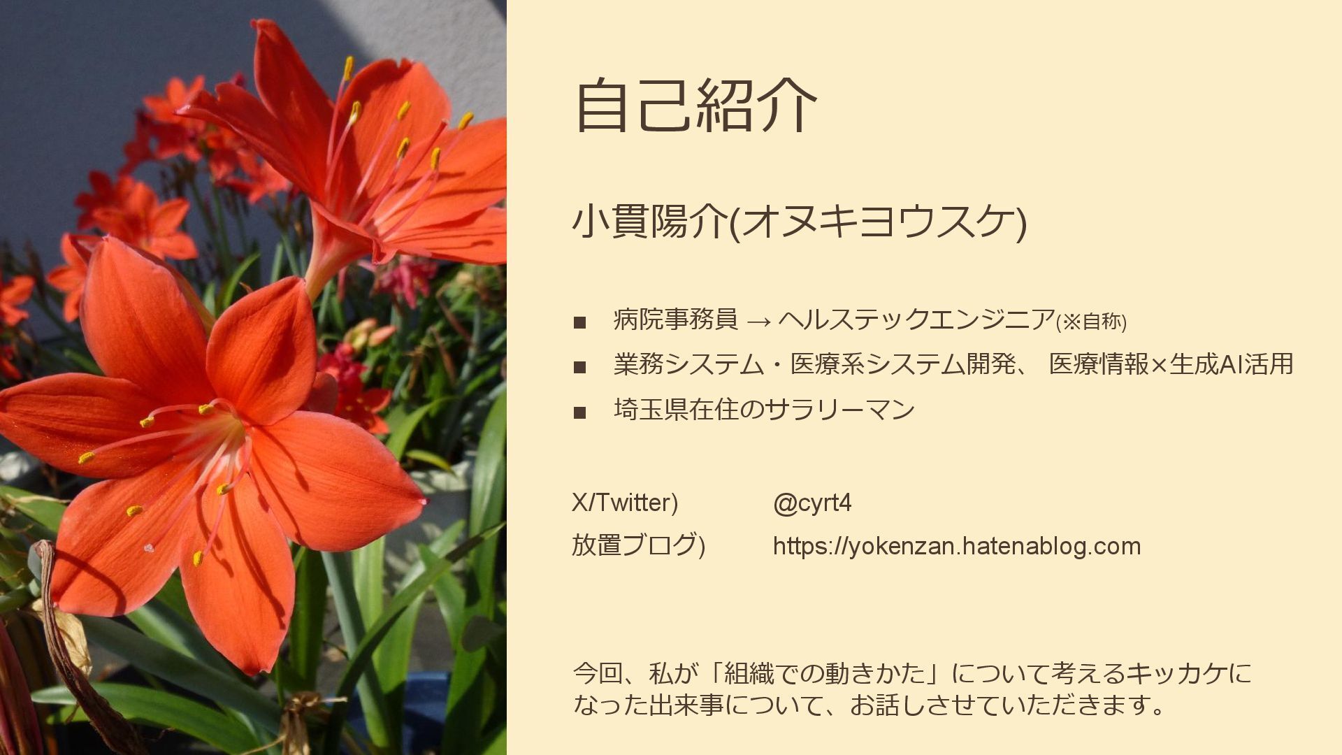 埼玉県在住のサラリーマン X/Twitter) @cyrt4 放置ブログ) https://yokenzan.hatenablog.com 今回、私が「組織での動きかた」について考えるキッカケに なった出来事について、お話しさせていただきます。