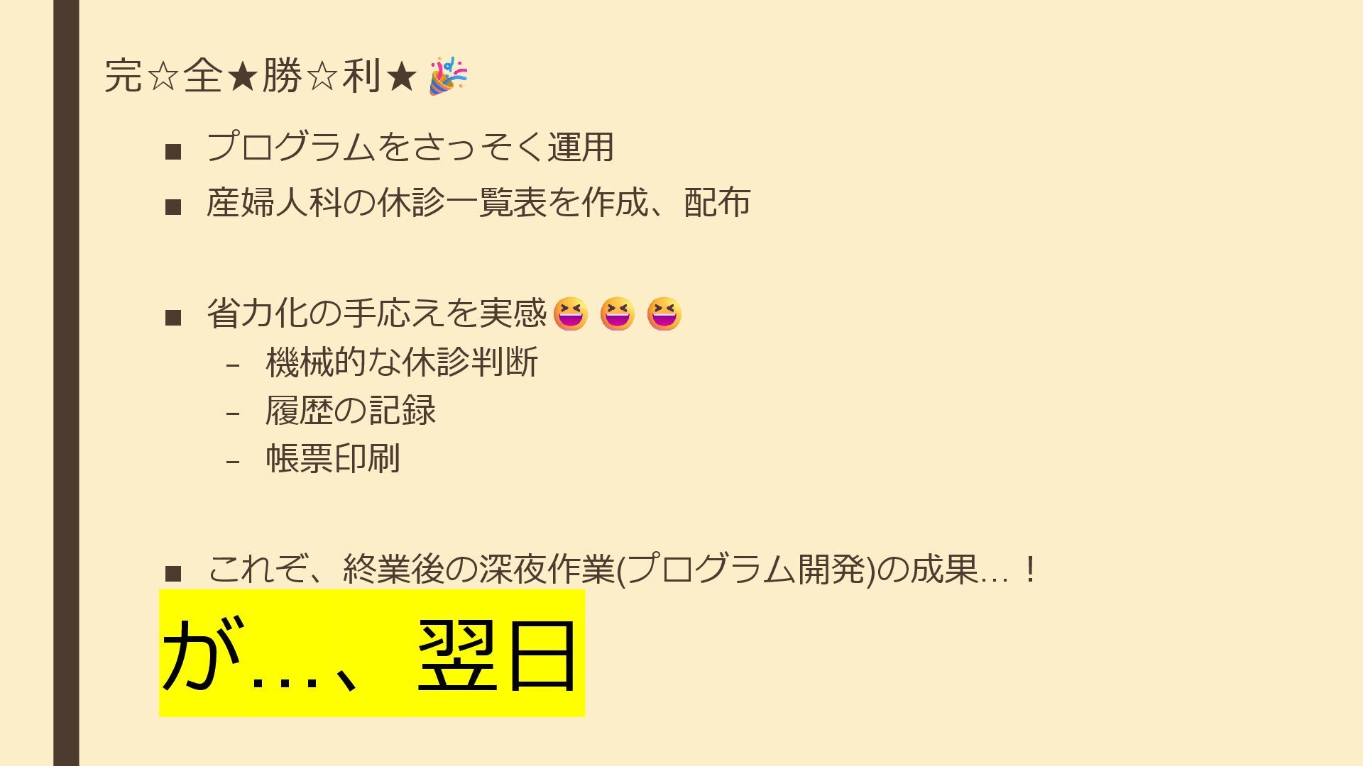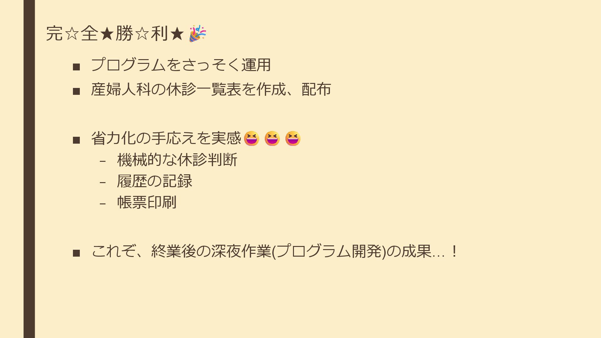 ▪ プログラムをさっそく運用 ▪ 産婦人科の休診一覧表を作成、配布 ▪ 省力化の手応えを実感 – 機械的な休診判断 – 履歴の記録