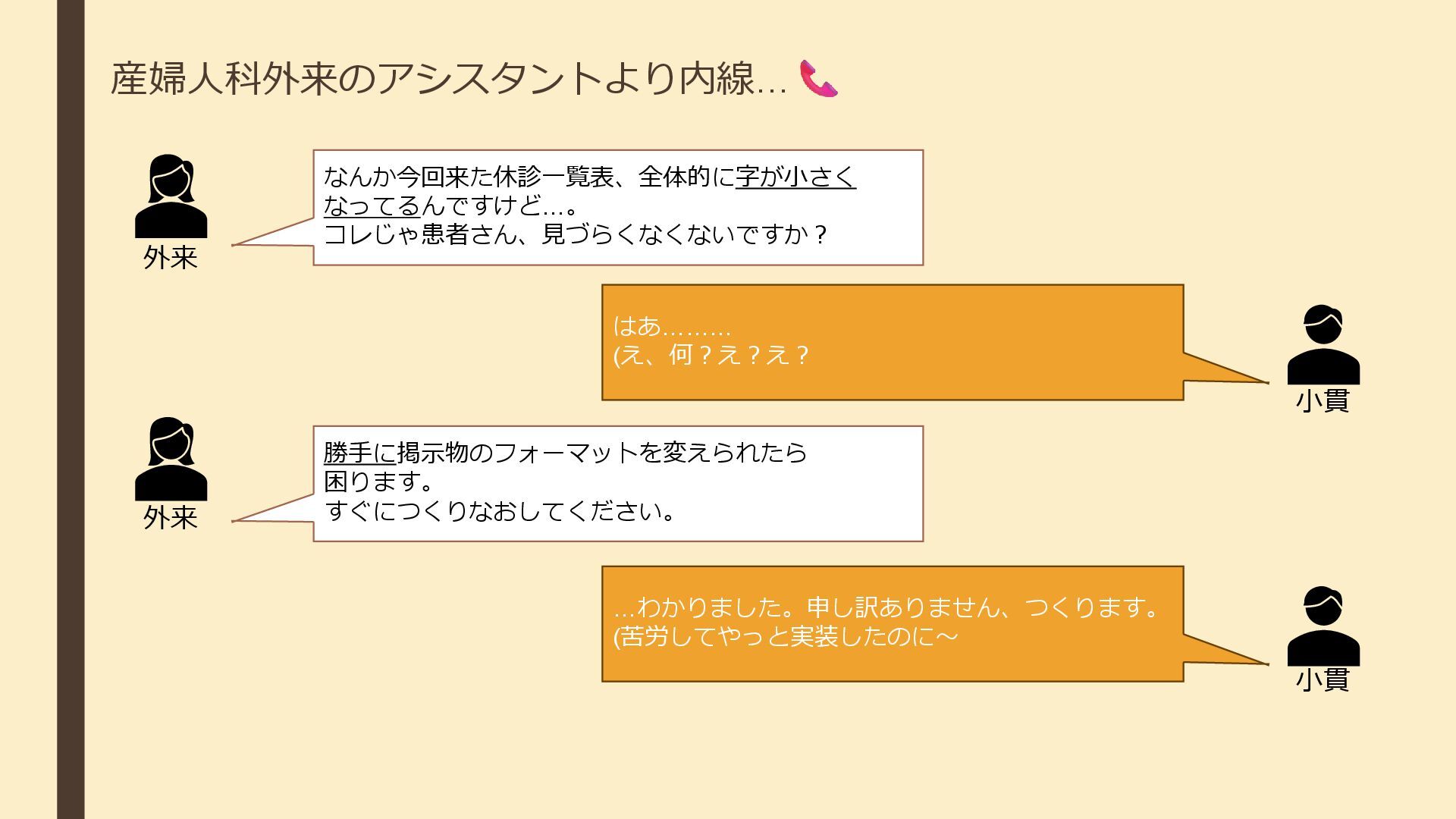 産婦人科外来のアシスタントより内線… なんか今回来た休診一覧表、全体的に字が小さく なってるんですけど…。 コレじゃ患者さん、見づらくなくないですか? 勝手に掲示物のフォーマットを変えられたら 困ります。 すぐにつくりなおしてください。 はあ……… (え、何?え?え? …わかりました。申し訳ありません、つくります。