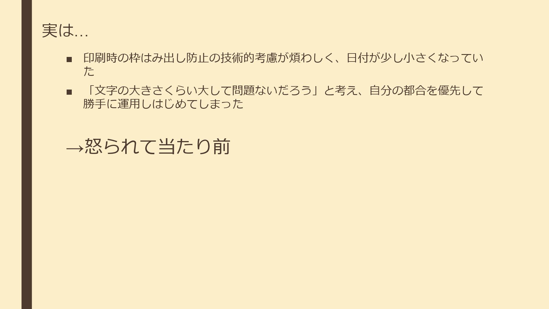 ▪ 印刷時の枠はみ出し防止の技術的考慮が煩わしく、日付が少し小さくなってい た ▪ 「文字の大きさくらい大して問題ないだろう」と考え、自分の都合を優先して 勝手に運用しはじめてしまった →怒られて当たり前 実は…