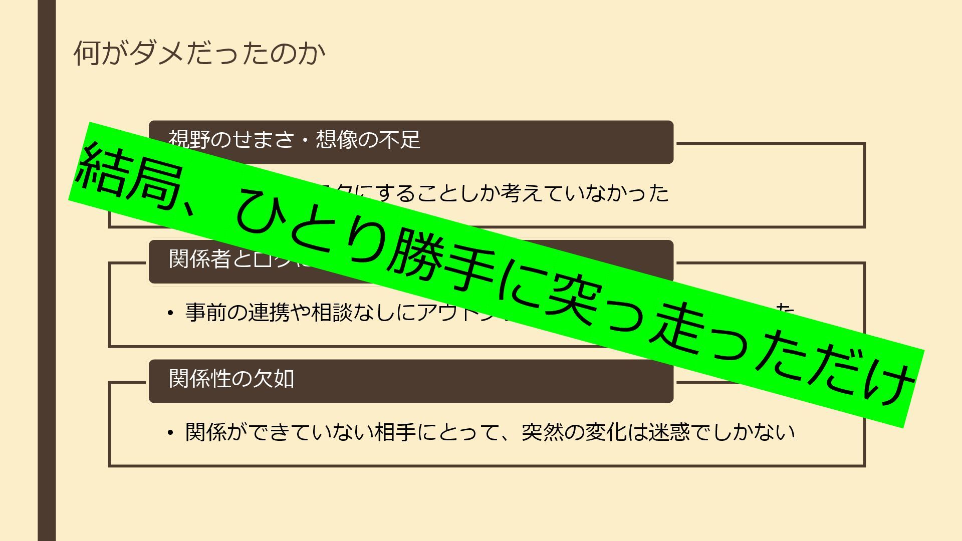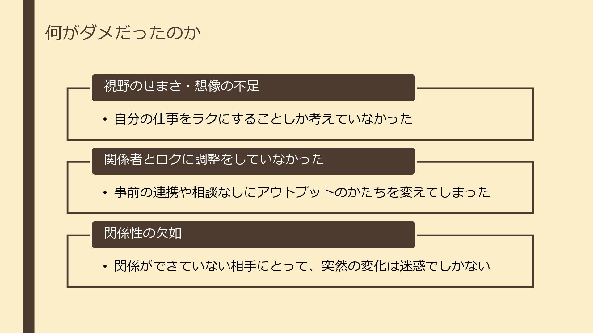 • 自分の仕事をラクにすることしか考えていなかった 視野のせまさ・想像の不足 • 事前の連携や相談なしにアウトプットのかたちを変えてしまった 関係者とロクに調整をしていなかった • 関係ができていない相手にとって、突然の変化は迷惑でしかない 関係性の欠如 何がダメだったのか