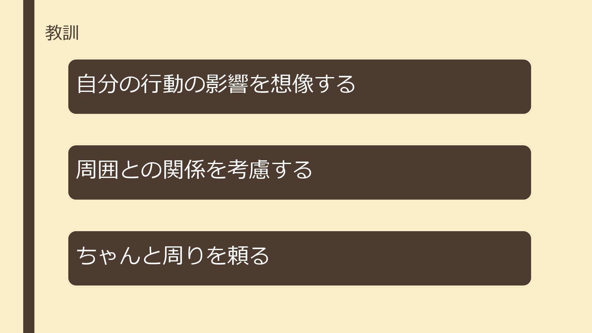 自分の行動の影響を想像する 周囲との関係を考慮する ちゃんと周りを頼る 教訓