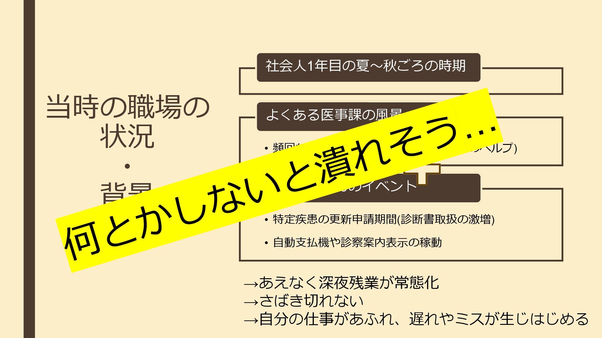 当時の職場の 状況 ・ 背景 社会人1年目の夏~秋ごろの時期 • 頻回な中座と離席(外線、内線、他部署のヘルプ) よくある医事課の風景 • 特定疾患の更新申請期間(診断書取扱の激増)