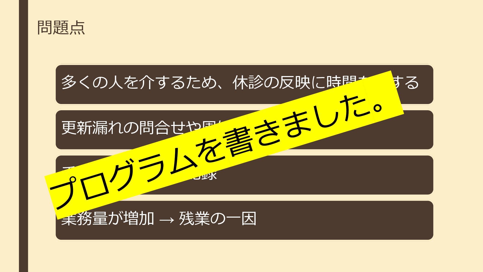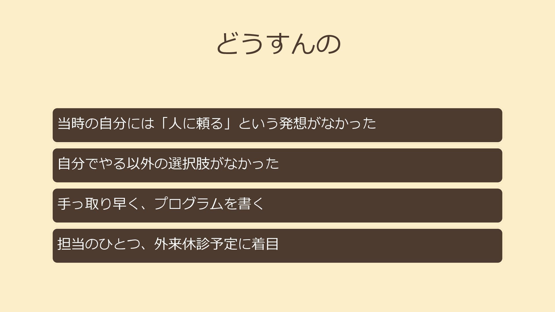 どうすんの 当時の自分には「人に頼る」という発想がなかった 自分でやる以外の選択肢がなかった 手っ取り早く、プログラムを書く 担当のひとつ、外来休診予定に着目