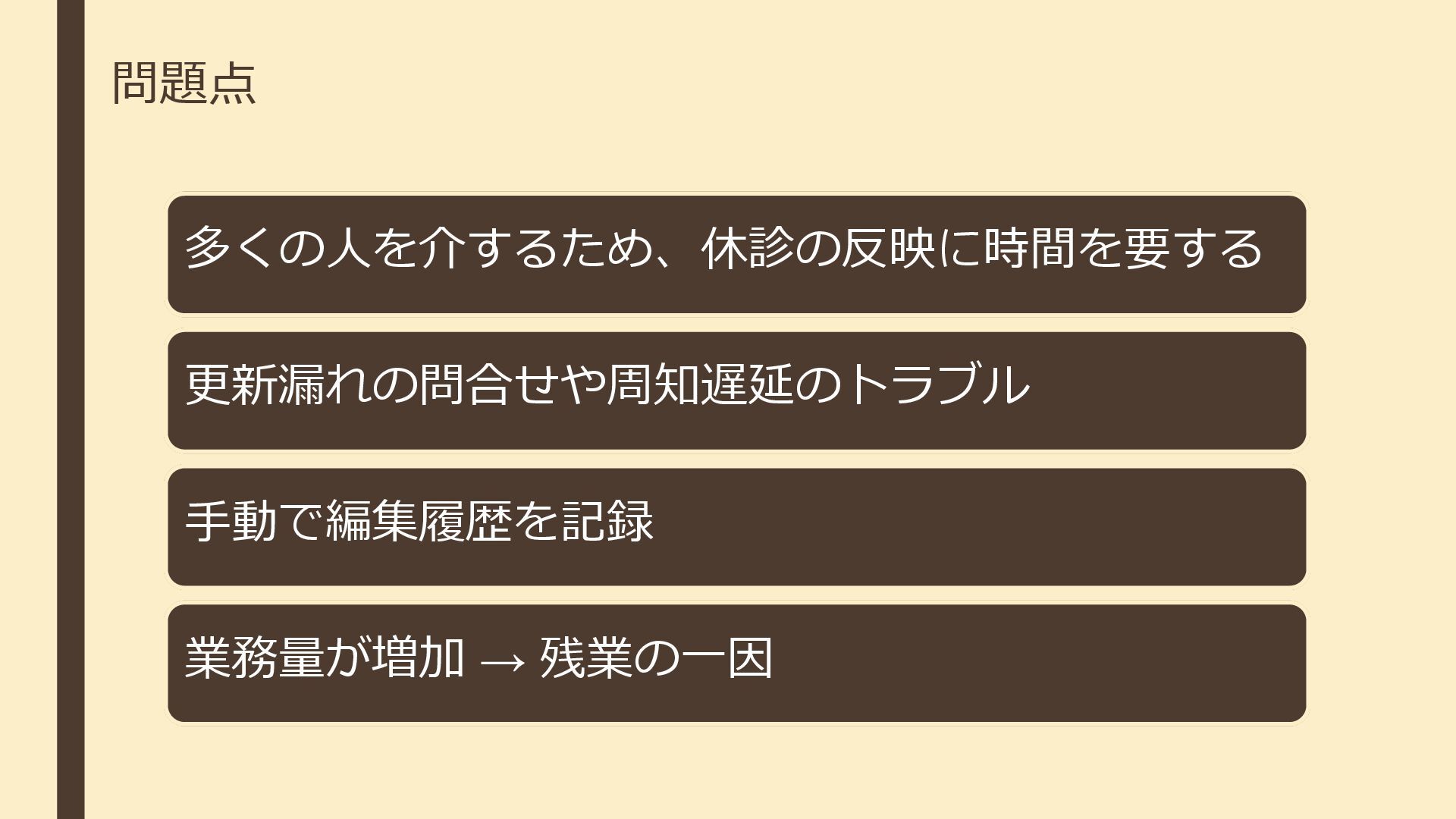 多くの人を介するため、休診の反映に時間を要する 更新漏れの問合せや周知遅延のトラブル 手動で編集履歴を記録 業務量が増加 → 残業の一因 問題点