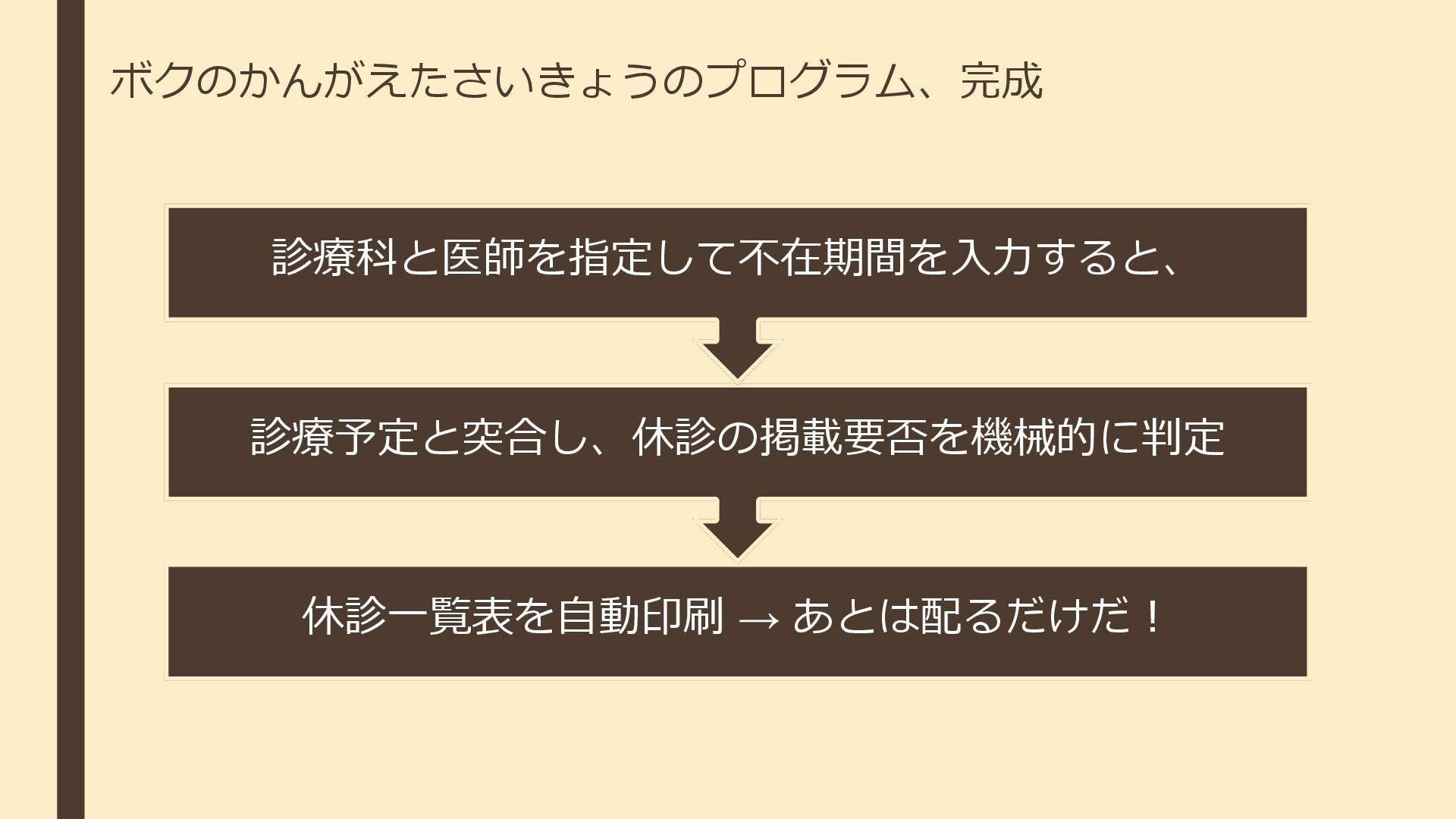 休診一覧表を自動印刷 → あとは配るだけだ! 診療予定と突合し、休診の掲載要否を機械的に判定 診療科と医師を指定して不在期間を入力すると、 ボクのかんがえたさいきょうのプログラム、完成