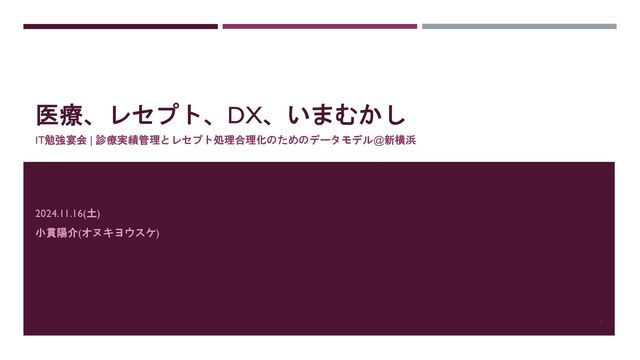 医療、レセプト、DX、いまむかし IT勉強宴会 | 診療実績管理とレセプト処理合理化のためのデータモデル@新横浜 2024.11.16(土) 小貫陽介(オヌキヨウスケ) 1
