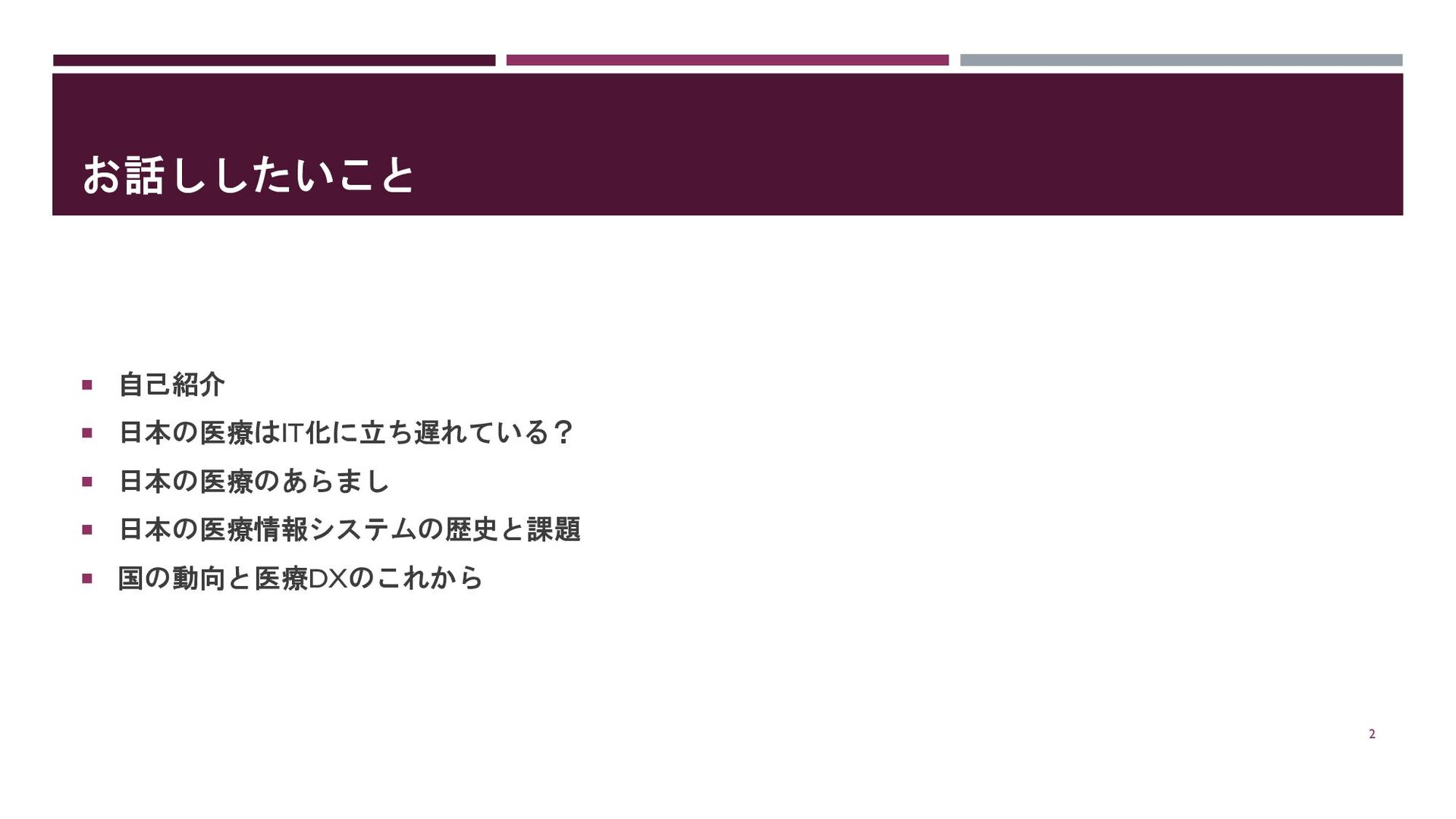 お話ししたいこと 自己紹介 日本の医療はIT化に立ち遅れている? 日本の医療のあらまし 日本の医療情報システムの歴史と課題