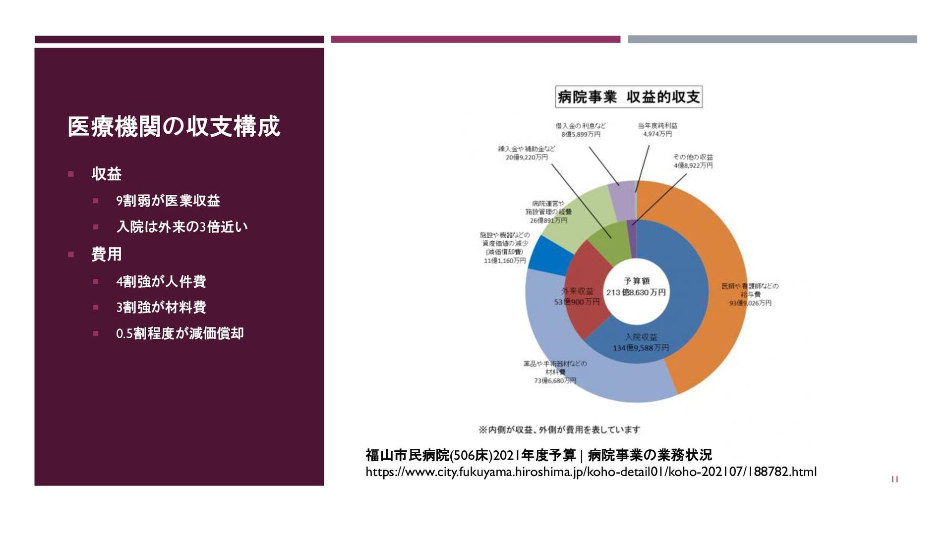 4割強が人件費 3割強が材料費 0.5割程度が減価償却 福山市民病院(506床)2021年度予算 | 病院事業の業務状況 https://www.city.fukuyama.hiroshima.jp/koho-detail01/koho-202107/188782.html 11