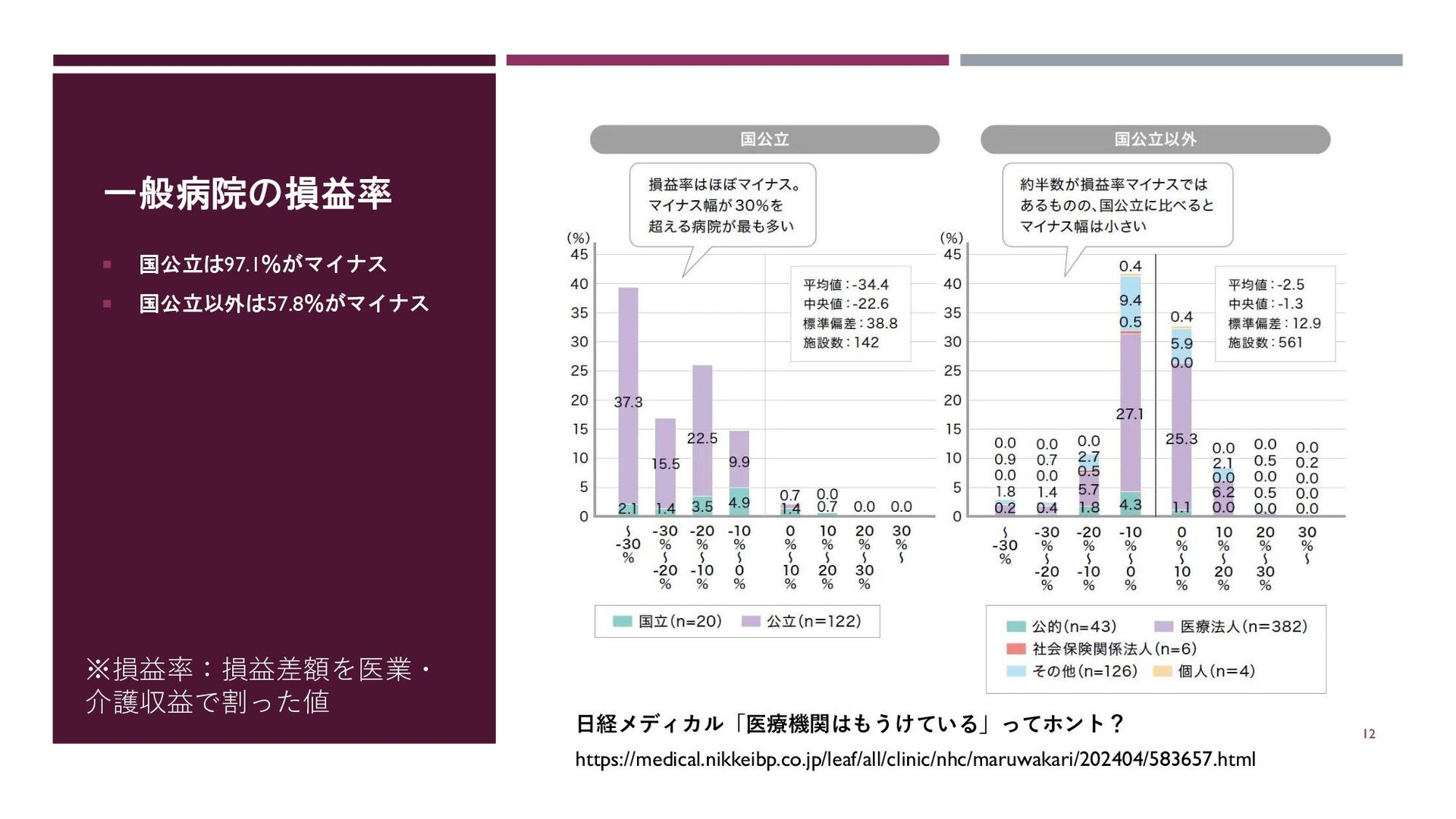 一般病院の損益率 国公立は97.1%がマイナス 国公立以外は57.8%がマイナス 日経メディカル「医療機関はもうけている」ってホント? https://medical.nikkeibp.co.jp/leaf/all/clinic/nhc/maruwakari/202404/583657.html ※損益率:損益差額を医業・ 介護収益で割った値 12