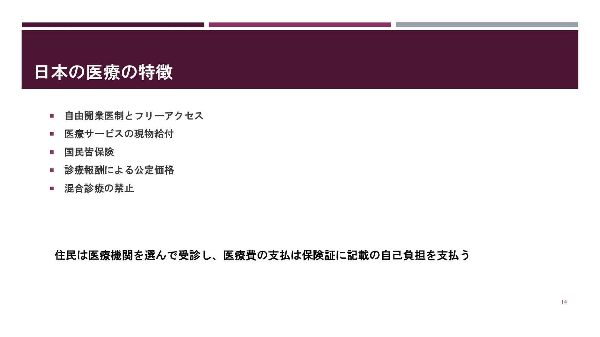 日本の医療の特徴 自由開業医制とフリーアクセス 医療サービスの現物給付 国民皆保険 診療報酬による公定価格