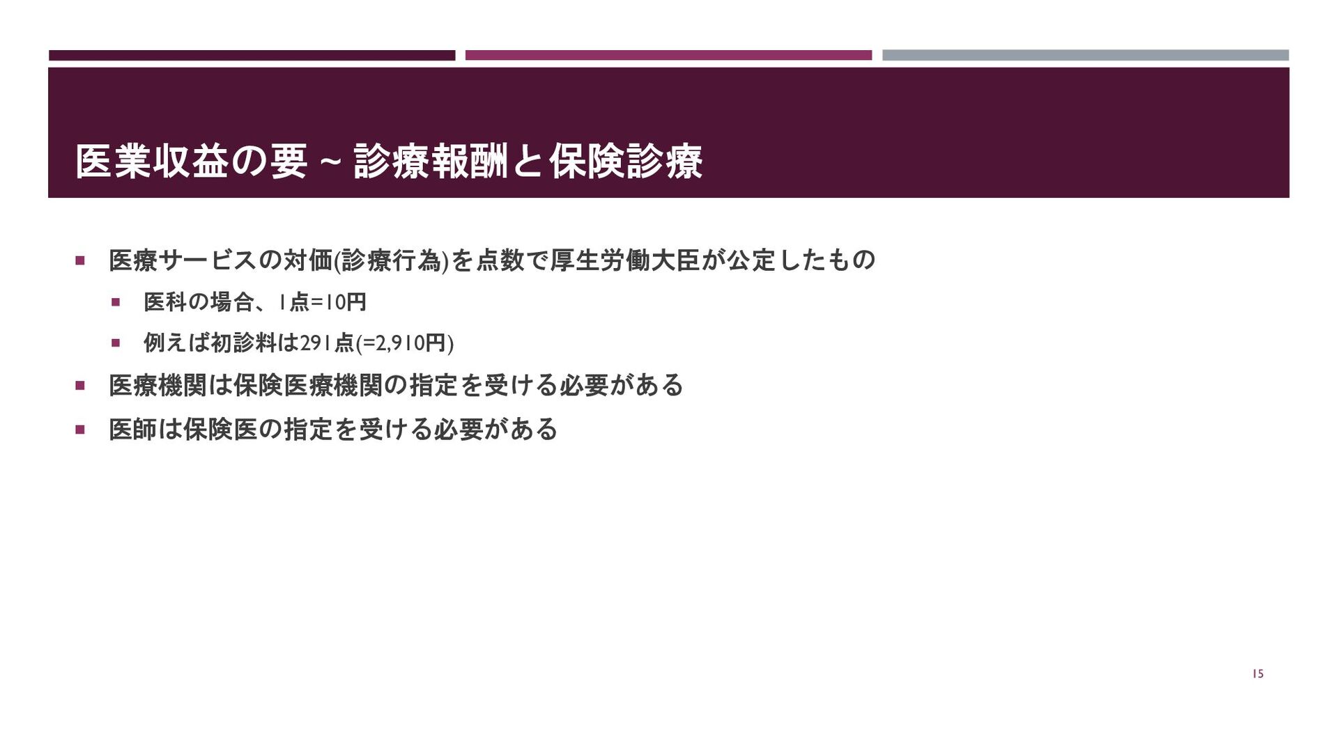 医業収益の要 ~ 診療報酬と保険診療 医療サービスの対価(診療行為)を点数で厚生労働大臣が公定したもの 医科の場合、1点=10円 例えば初診料は291点(=2,910円)