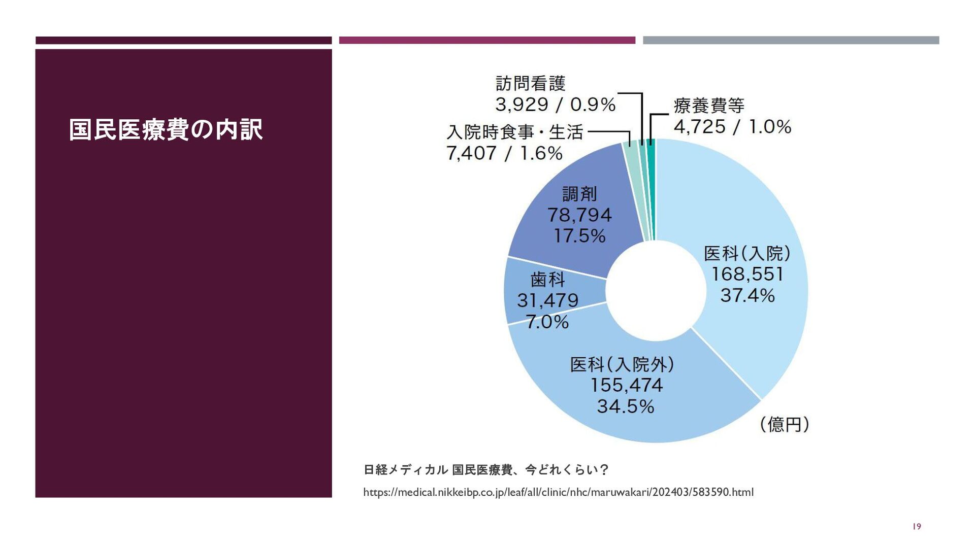 国民医療費の内訳 日経メディカル 国民医療費、今どれくらい? https://medical.nikkeibp.co.jp/leaf/all/clinic/nhc/maruwakari/202403/583590.html 19
