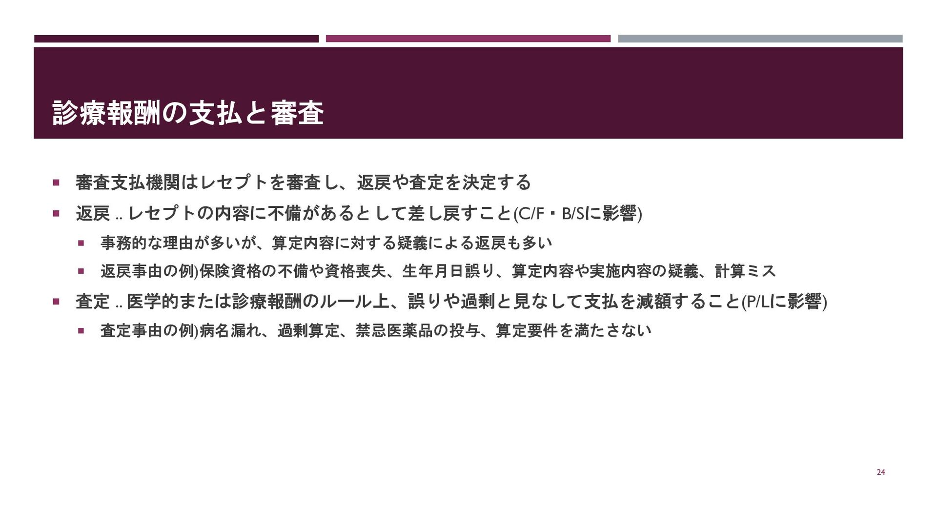 返戻事由の例)保険資格の不備や資格喪失、生年月日誤り、算定内容や実施内容の疑義、計算ミス 査定 .. 医学的または診療報酬のルール上、誤りや過剰と見なして支払を減額すること(P/Lに影響) 査定事由の例)病名漏れ、過剰算定、禁忌医薬品の投与、算定要件を満たさない 24