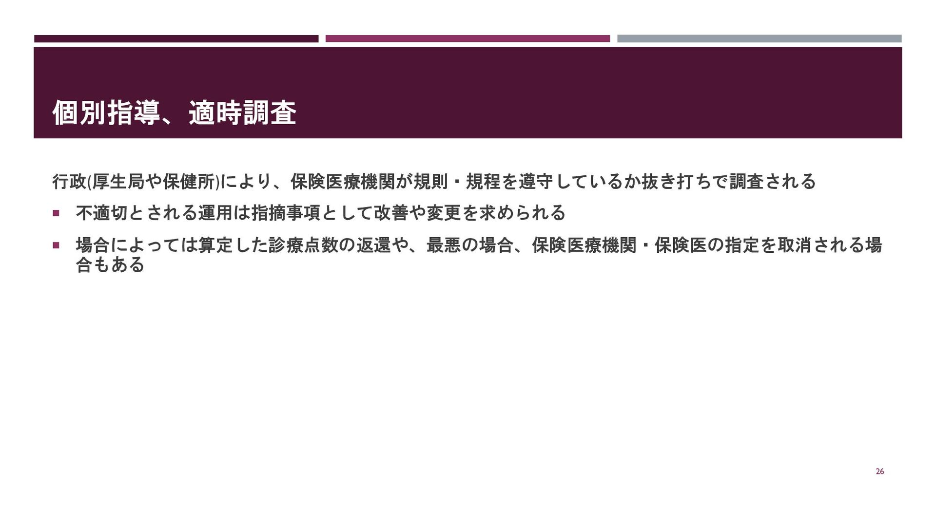 個別指導、適時調査 行政(厚生局や保健所)により、保険医療機関が規則・規程を遵守しているか抜き打ちで調査される 不適切とされる運用は指摘事項として改善や変更を求められる 場合によっては算定した診療点数の返還や、最悪の場合、保険医療機関・保険医の指定を取消される場 合もある 26