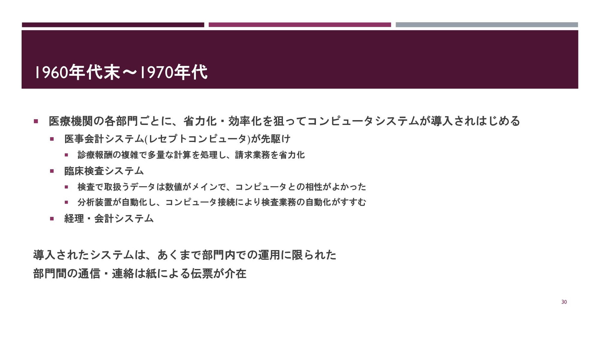 1960年代末~1970年代 医療機関の各部門ごとに、省力化・効率化を狙ってコンピュータシステムが導入されはじめる 医事会計システム(レセプトコンピュータ)が先駆け 診療報酬の複雑で多量な計算を処理し、請求業務を省力化 臨床検査システム
