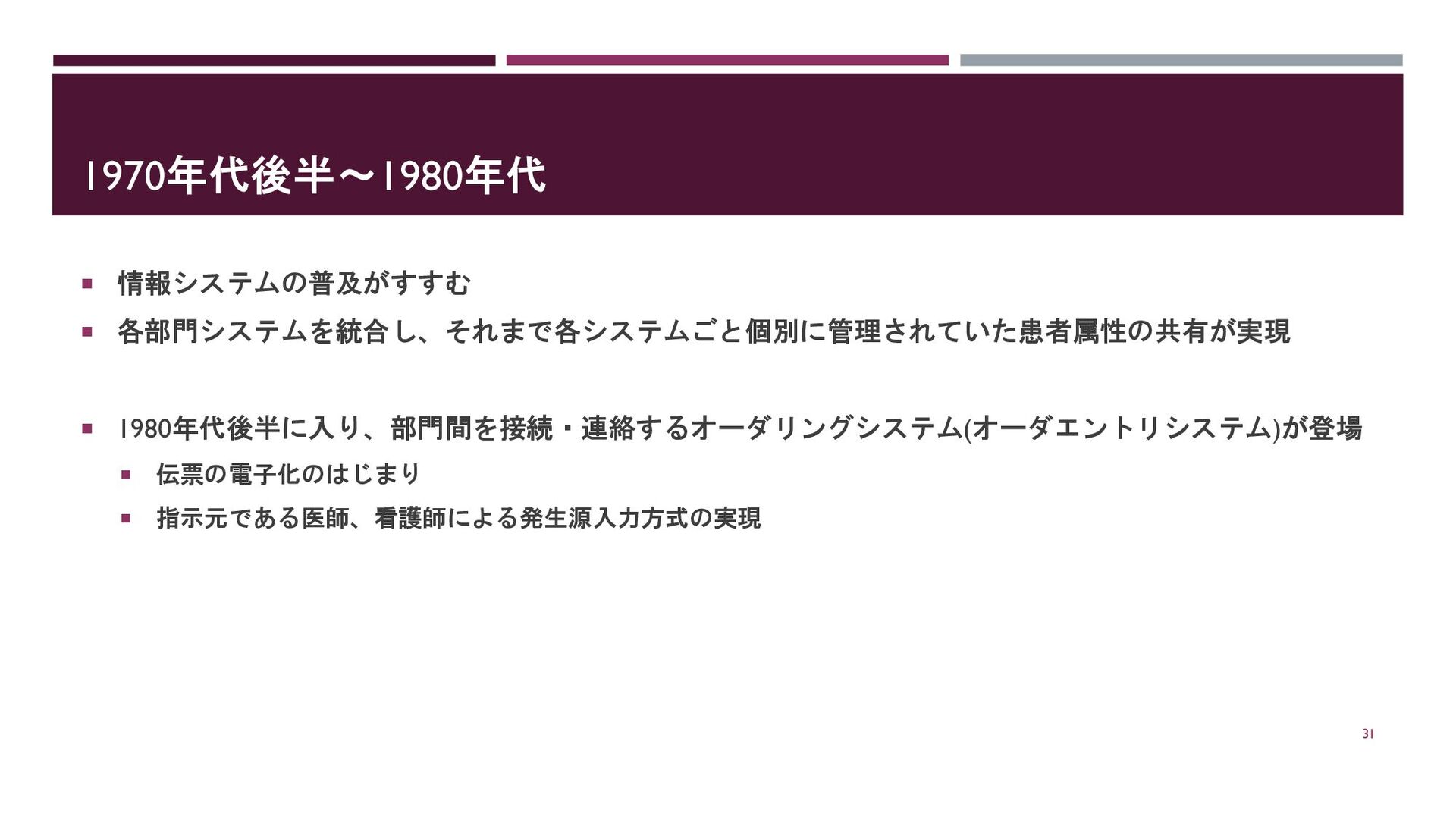1970年代後半~1980年代 情報システムの普及がすすむ 各部門システムを統合し、それまで各システムごと個別に管理されていた患者属性の共有が実現 1980年代後半に入り、部門間を接続・連絡するオーダリングシステム(オーダエントリシステム)が登場 伝票の電子化のはじまり