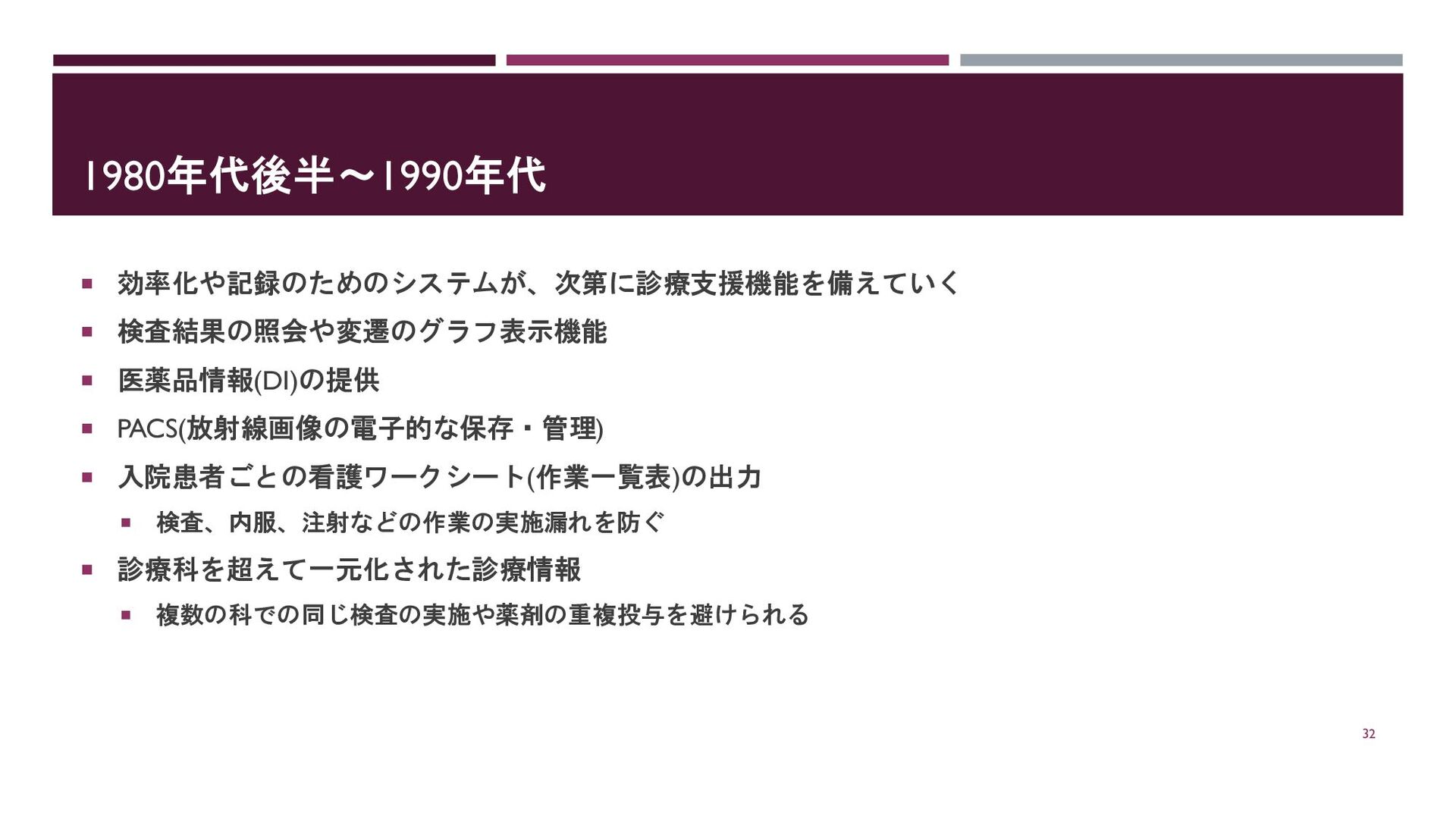 1980年代後半~1990年代 効率化や記録のためのシステムが、次第に診療支援機能を備えていく 検査結果の照会や変遷のグラフ表示機能 医薬品情報(DI)の提供 PACS(放射線画像の電子的な保存・管理)