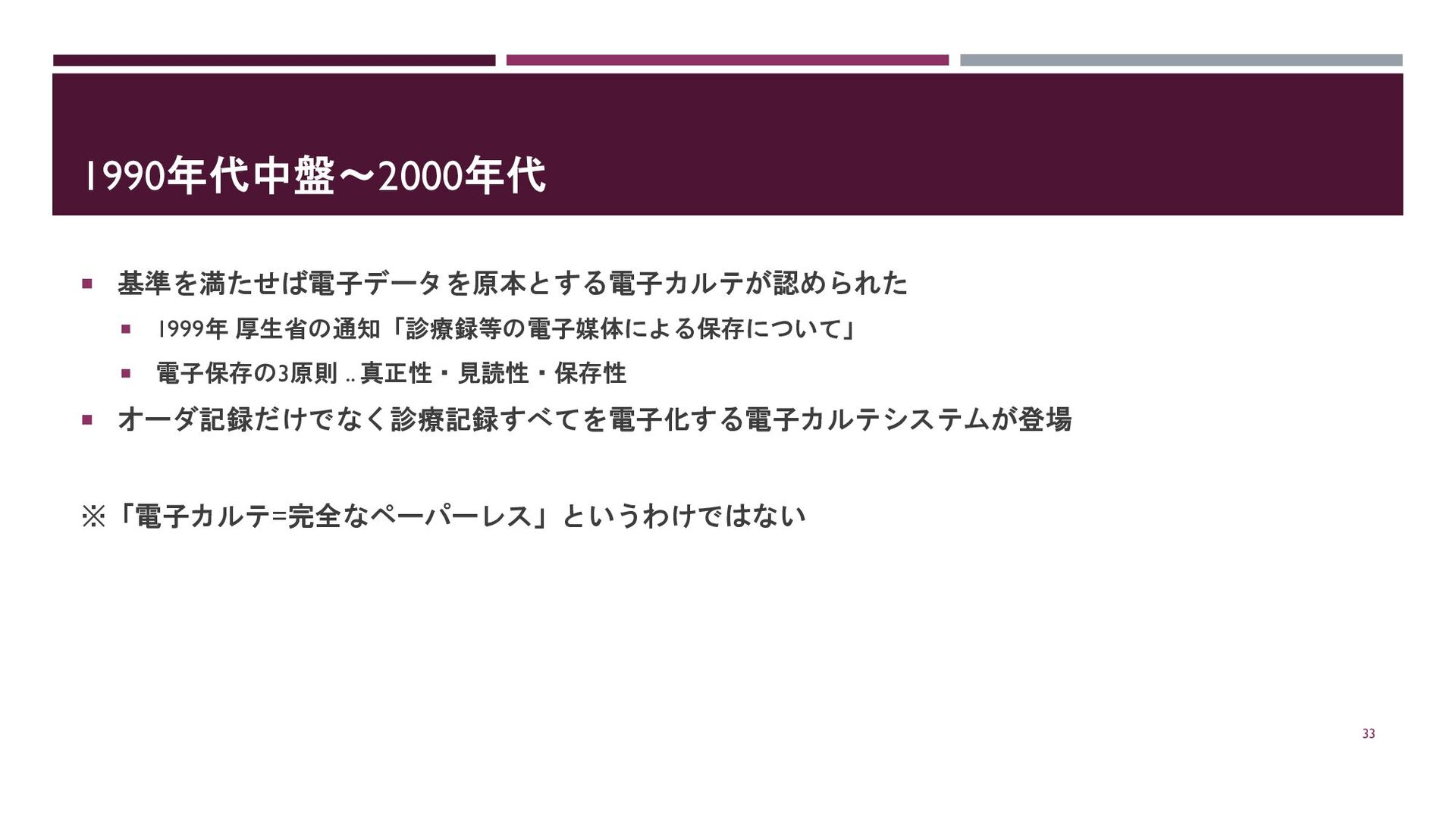 1990年代中盤~2000年代 基準を満たせば電子データを原本とする電子カルテが認められた 1999年 厚生省の通知「診療録等の電子媒体による保存について」 電子保存の3原則 .. 真正性・見読性・保存性