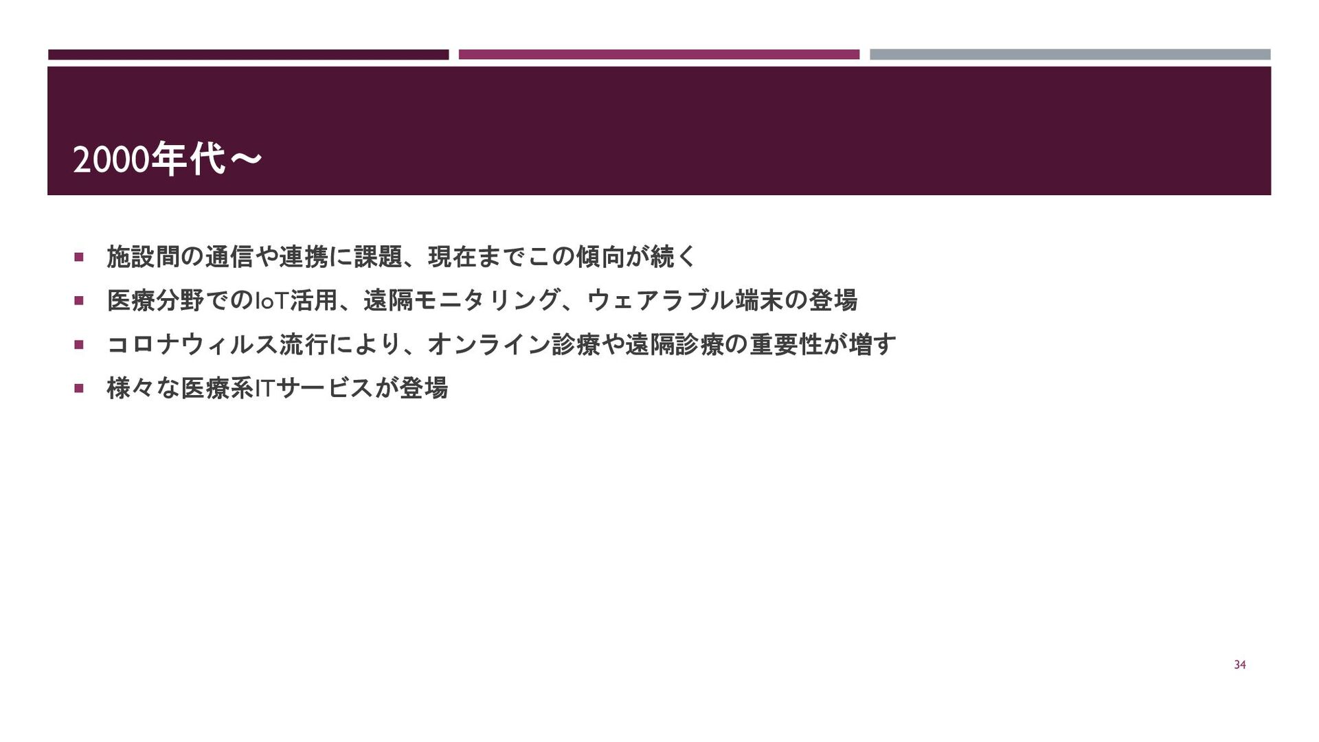 2000年代~ 施設間の通信や連携に課題、現在までこの傾向が続く 医療分野でのIoT活用、遠隔モニタリング、ウェアラブル端末の登場 コロナウィルス流行により、オンライン診療や遠隔診療の重要性が増す 様々な医療系ITサービスが登場 34